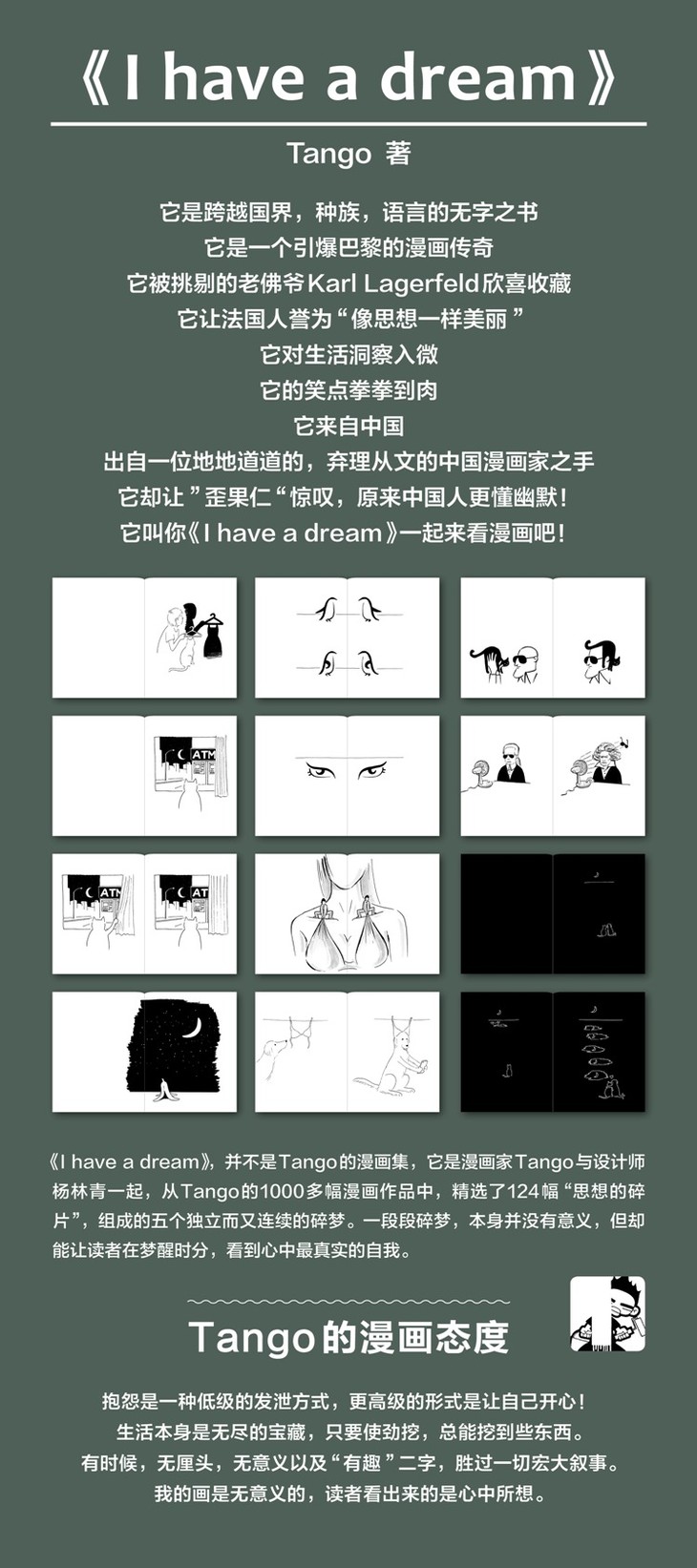 本书是漫画家Tango和设计师杨林青首次合作,从其2010-2015,5年间的1500多幅画作中精选了124幅,组成了一个个独立而又相互联系的梦境。