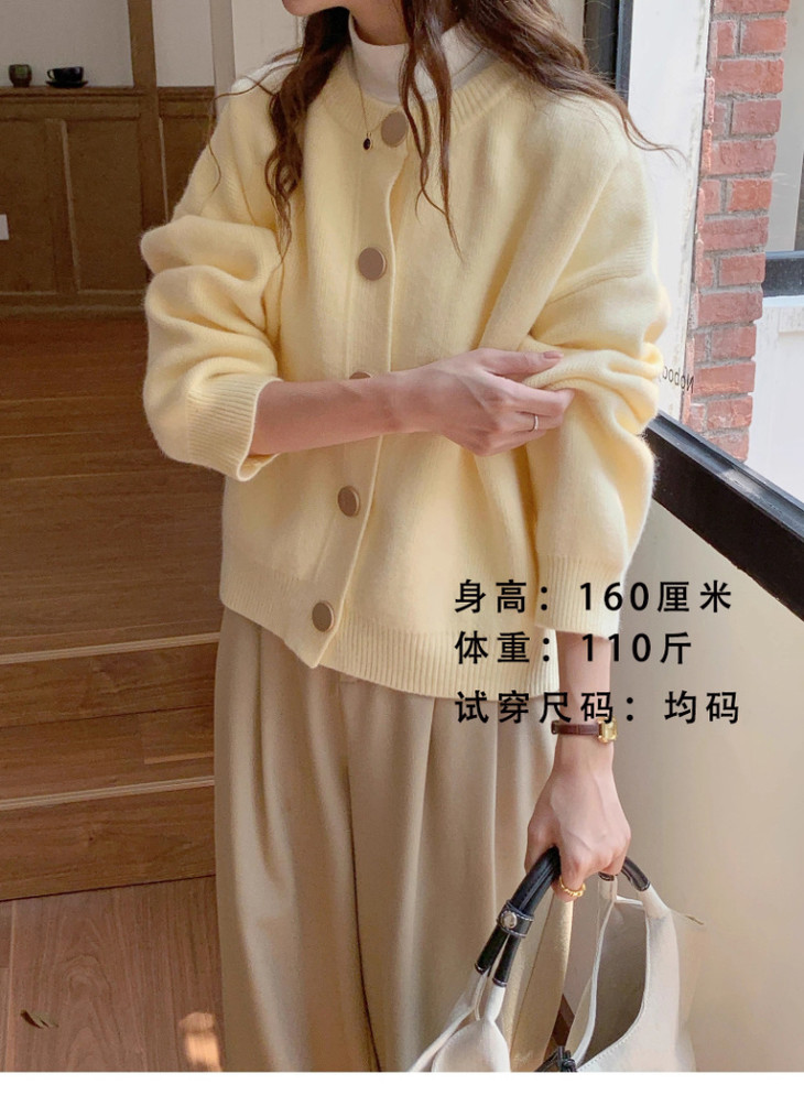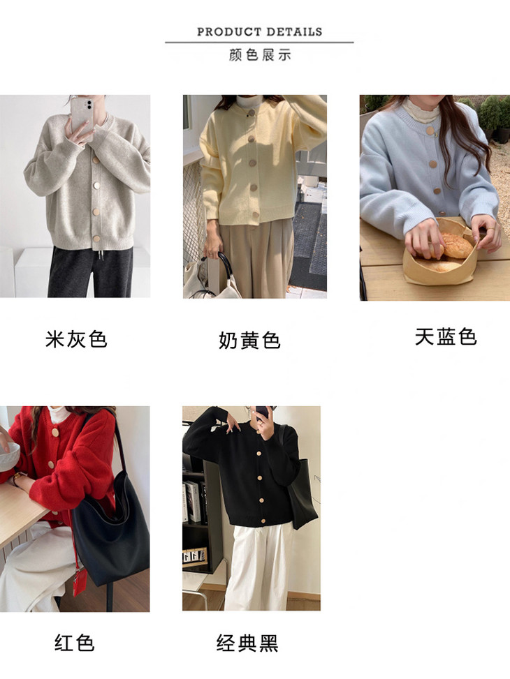 经典的圆领设计,怎么穿怎么好看,一点也不挑人 扣子用的是金色大纽扣,纽扣是精选的,有有光泽 整体看上去,高级又休闲又温柔 款式也是十分百搭,版型是宽松的,穿着舒服。