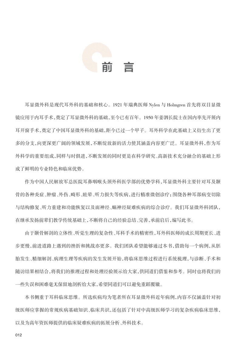 本书从解放军总医院耳鼻咽喉头颈外科医学部耳显微外科近2年的上千例临床病例中,精选35~40例典型、复杂、疑难、少见疾病作为导入。每一病例以病史检查、鉴别诊断、病例讨论、主任查房、手术记录、术后评价的书写形式展开,每一病例以2~3个关键临床点为核心,从胚胎发生、精细解剖、病理生理等疾病的发生发展开始,与诊断、手术和随访结果相结合,在深度和广度上阐述临床知识、进展、经验、技术、教训,将临床推理过程和处理经验展示出来。每一病例编写文字5000~8000字,约20幅高清临床图片,图文并茂,供耳科临床医师参考。