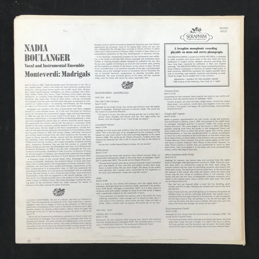 LP黑胶唱片 克劳迪奥·蒙特威尔地《牧歌》 娜迪亚·布朗热指挥厂牌:Seraphim