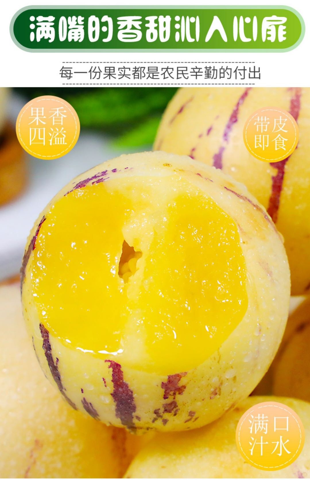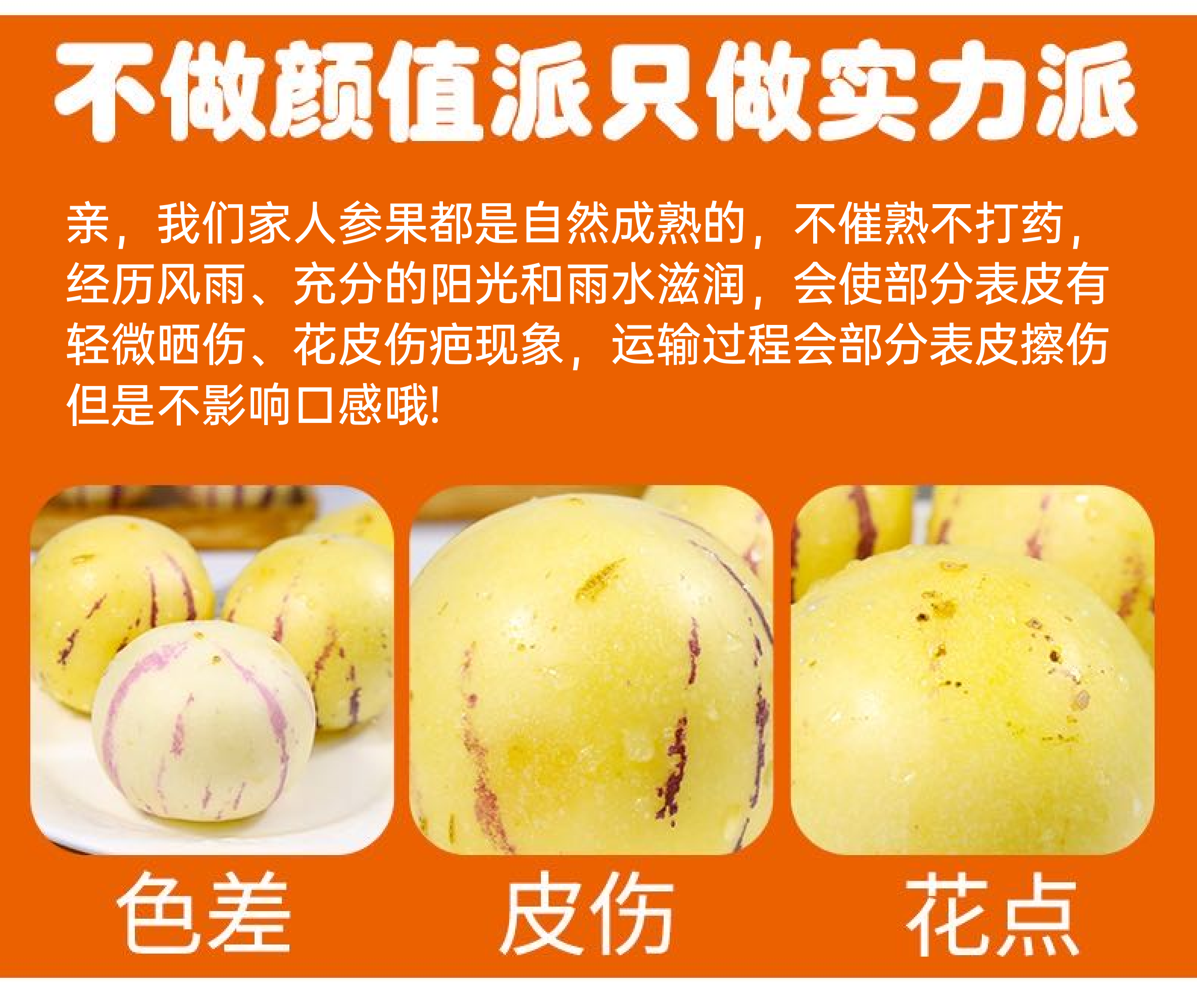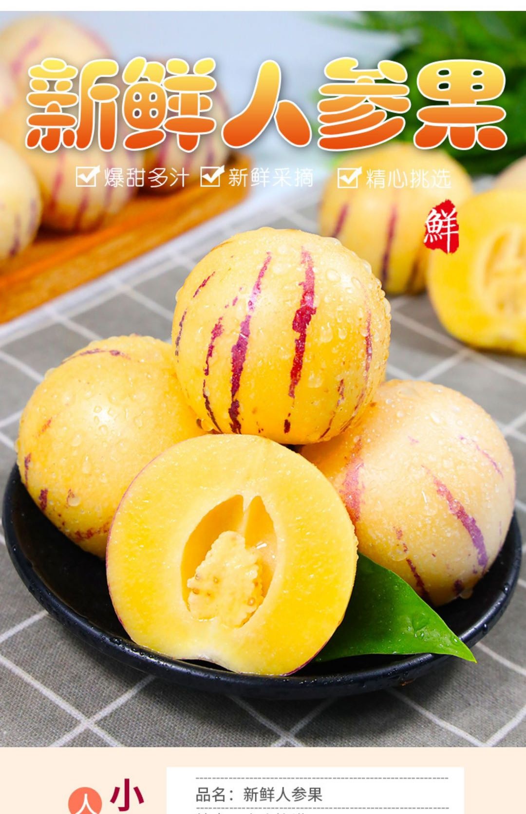 品名: 石林树熟人参果规格1:4.5斤大果彩箱 单果80-120g;约20-24个 包装方式:网套+纸箱/礼盒 快递:京东快递 运费模板:新疆、西藏、甘肃,青海,内蒙古,黑龙江,港澳台不发货;其他区域包邮 发货时效:48小时 发货地/产地:云南石林 保质期:收到后常温保存3-5天,冷藏保存3-7天 销售售卖期:4月底 周六周天、节假日除外,早上十点之前的订单是48小时发货 ,到货时间约为2-5天,请您耐心等待 |
