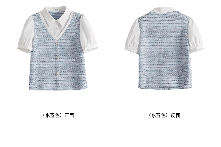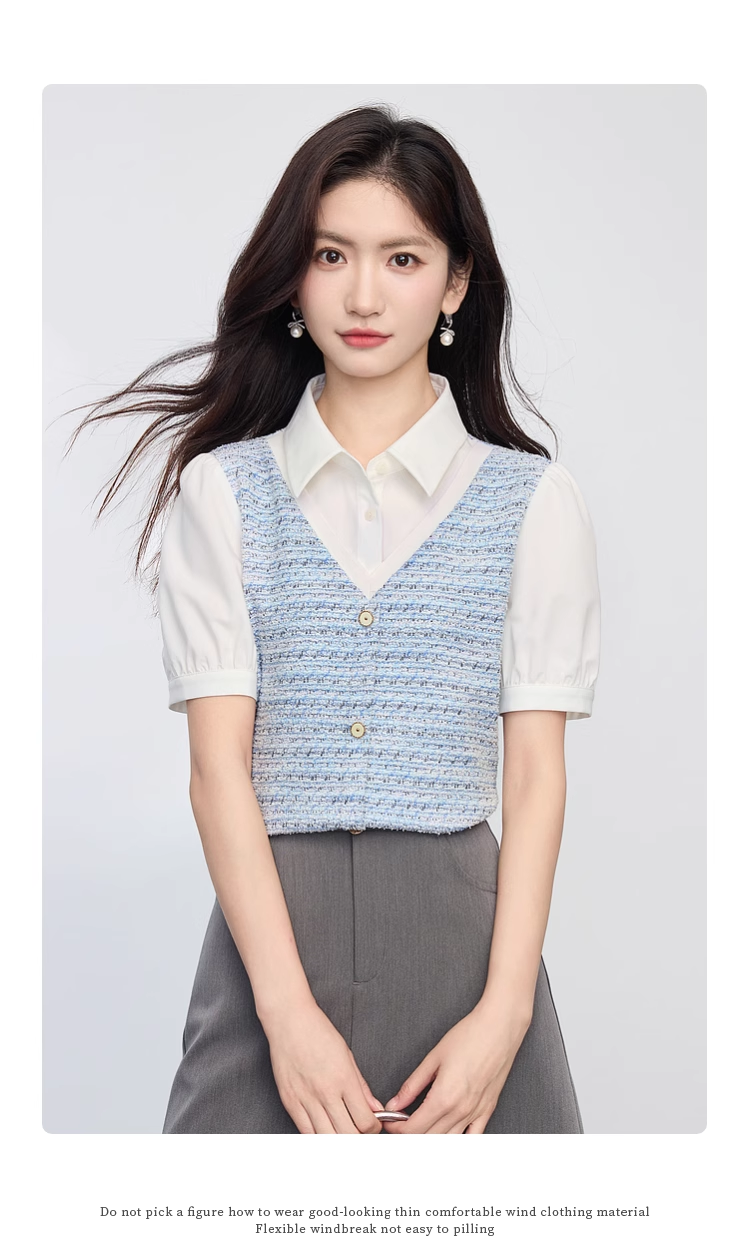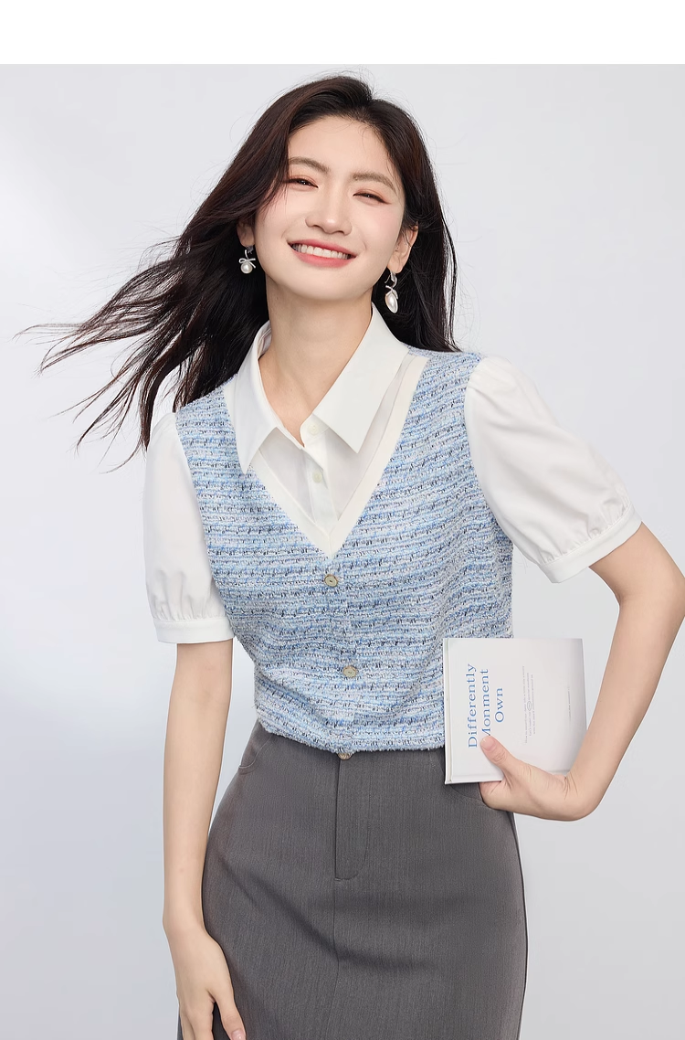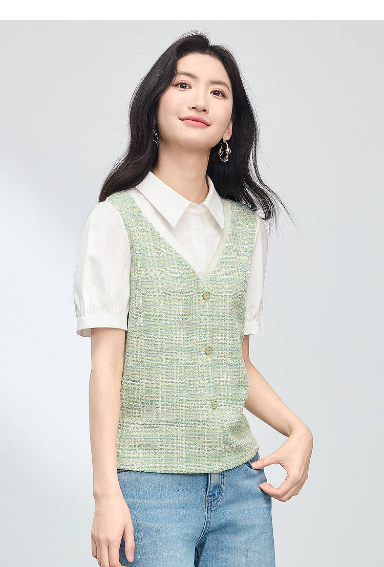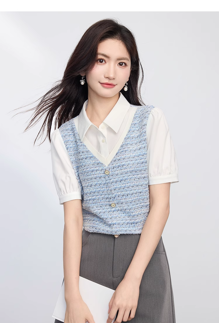 【专属特价】熙世界小香风马甲拼接短袖衬衫女假两件洋气别致上衣2025夏季新款