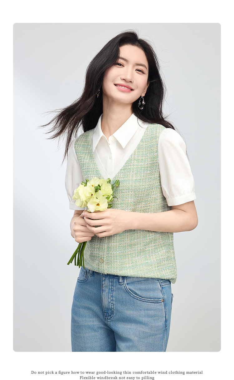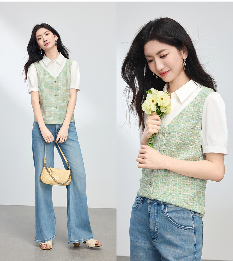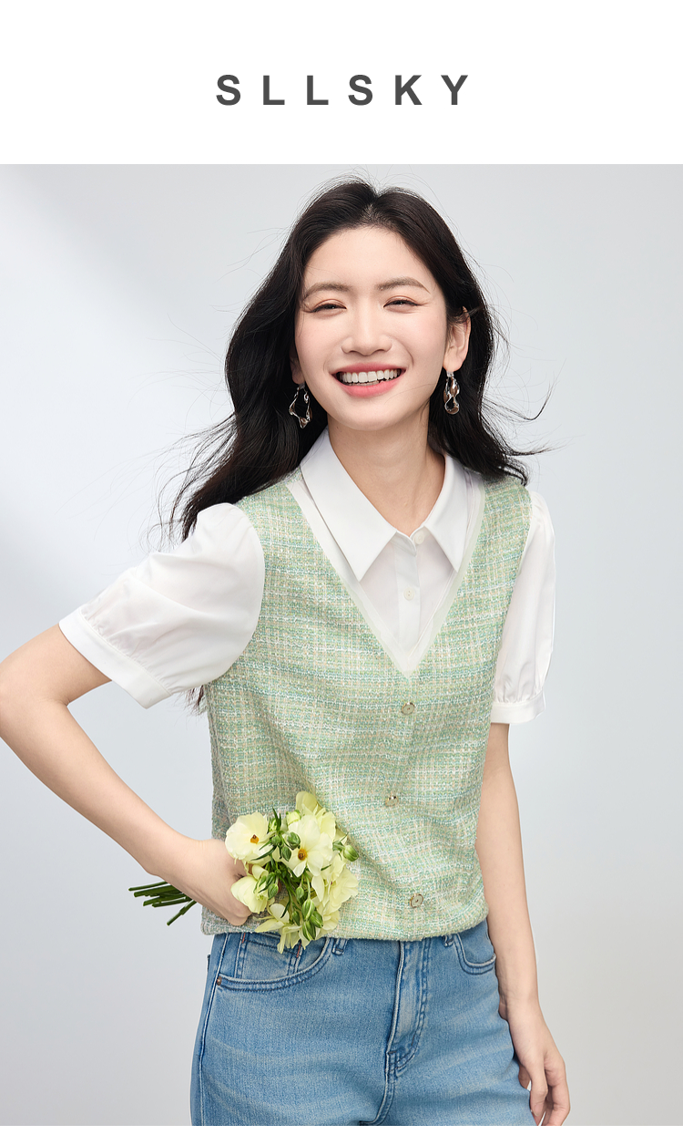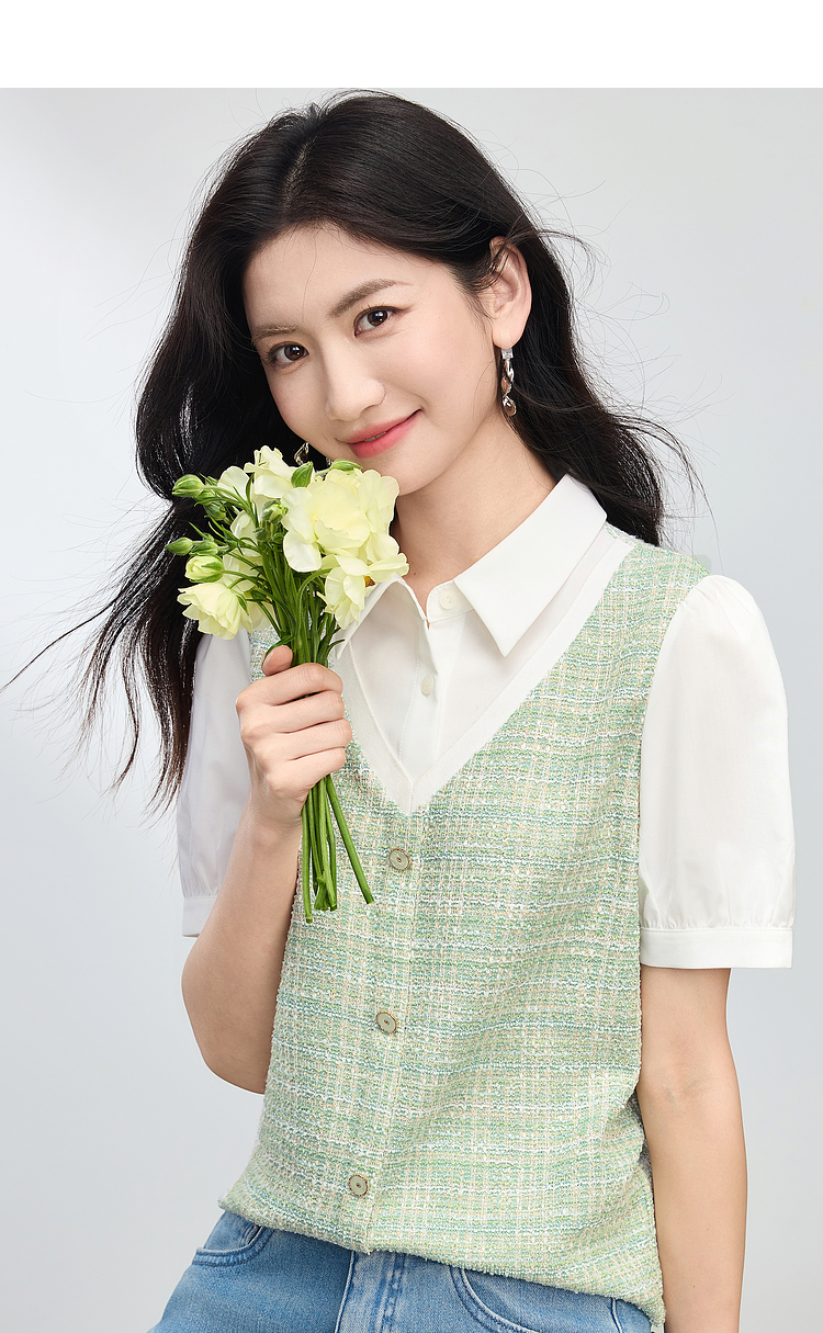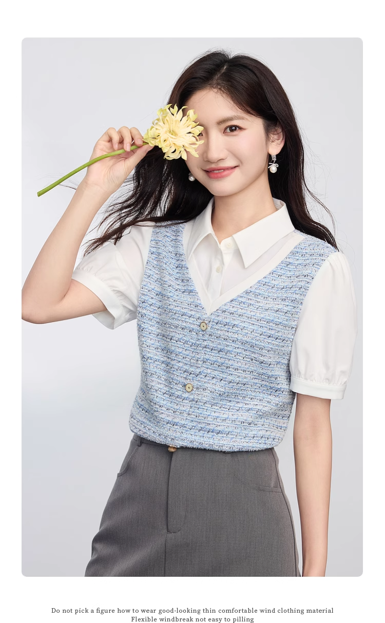 【专属特价】熙世界小香风马甲拼接短袖衬衫女假两件洋气别致上衣2025夏季新款