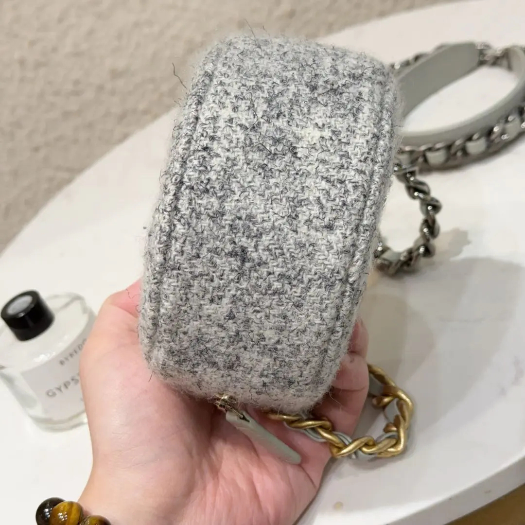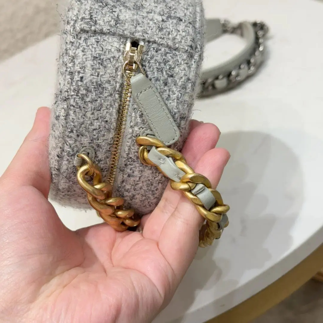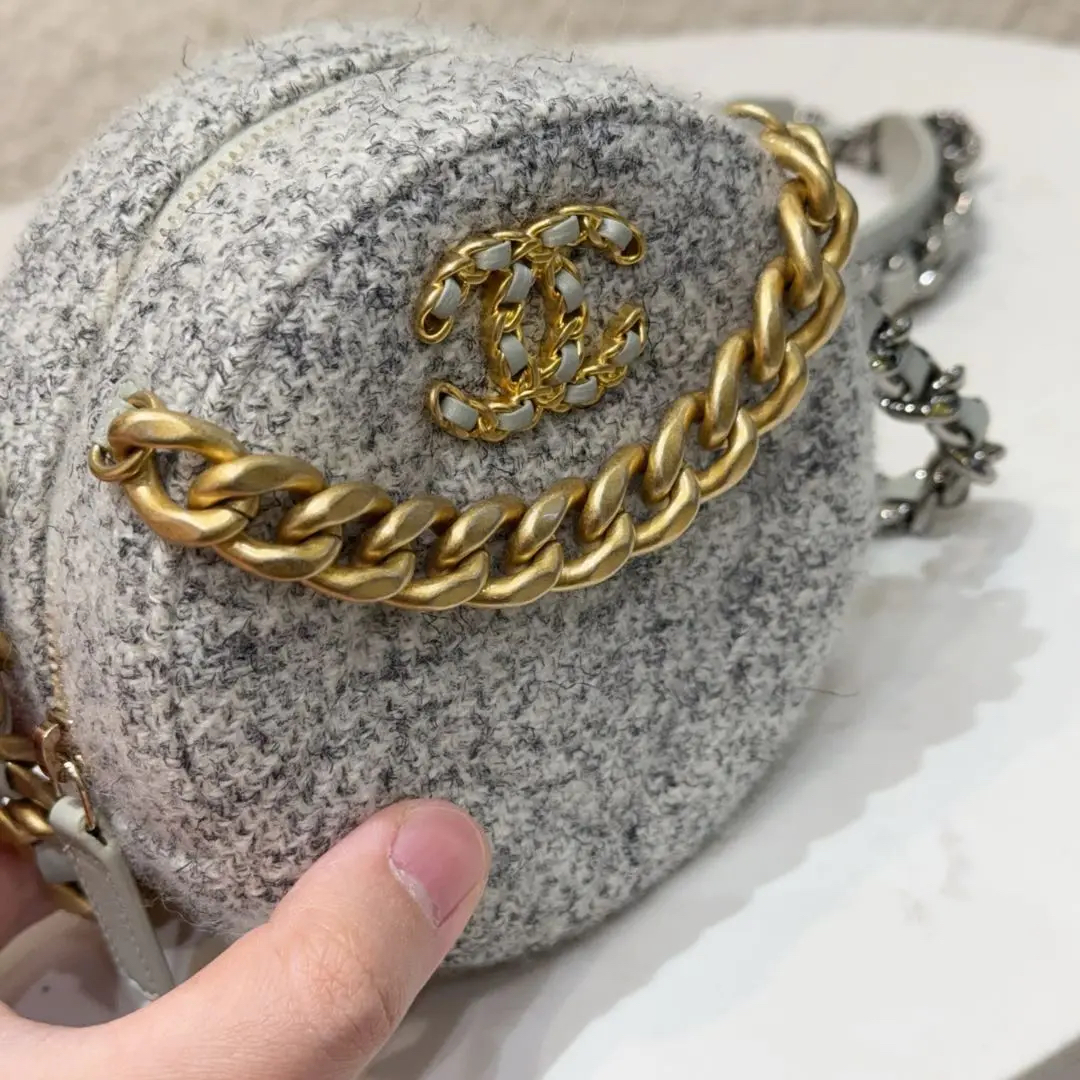 【商品详情】正品二手 Chanel 19bag mini 圆饼 灰色 毛呢 斜挎包🦊98新 12*12 镭射31开 配件:防尘袋。迷人凹造型小可爱 甜酷出街