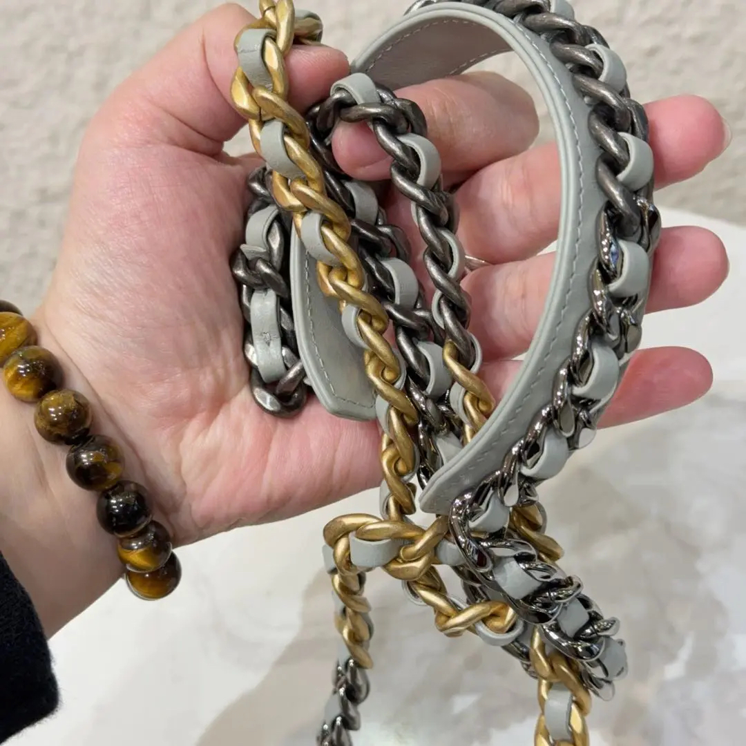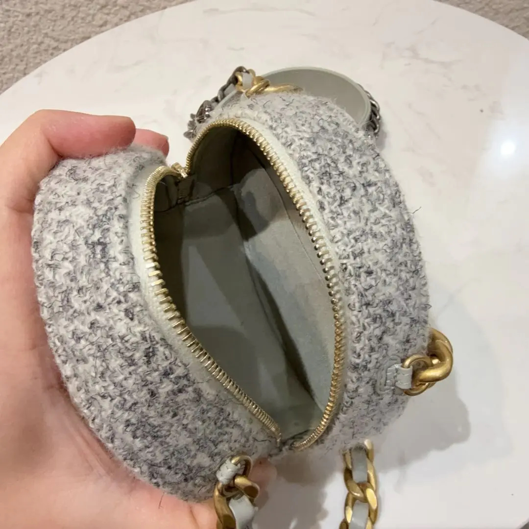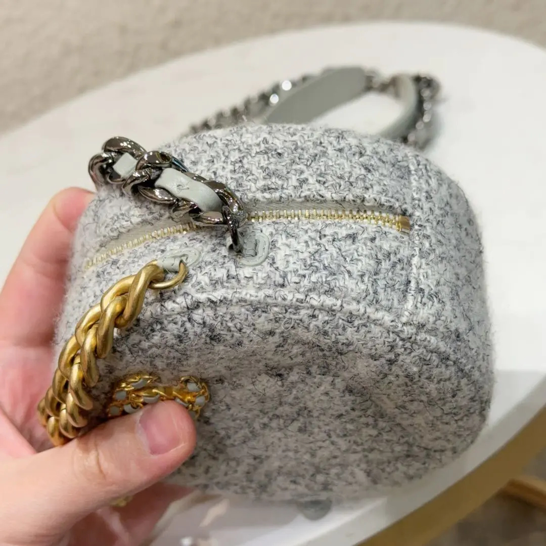 【商品详情】正品二手 Chanel 19bag mini 圆饼 灰色 毛呢 斜挎包🦊98新 12*12 镭射31开 配件:防尘袋。迷人凹造型小可爱 甜酷出街