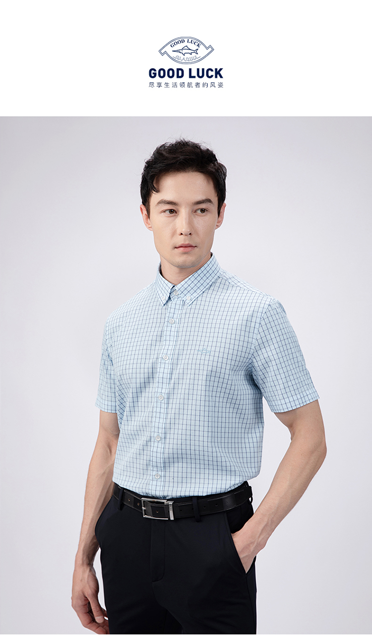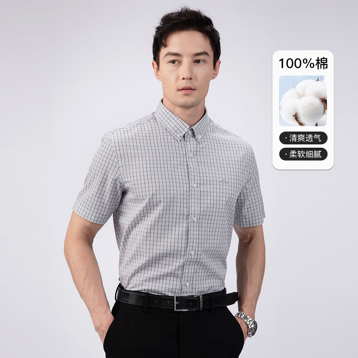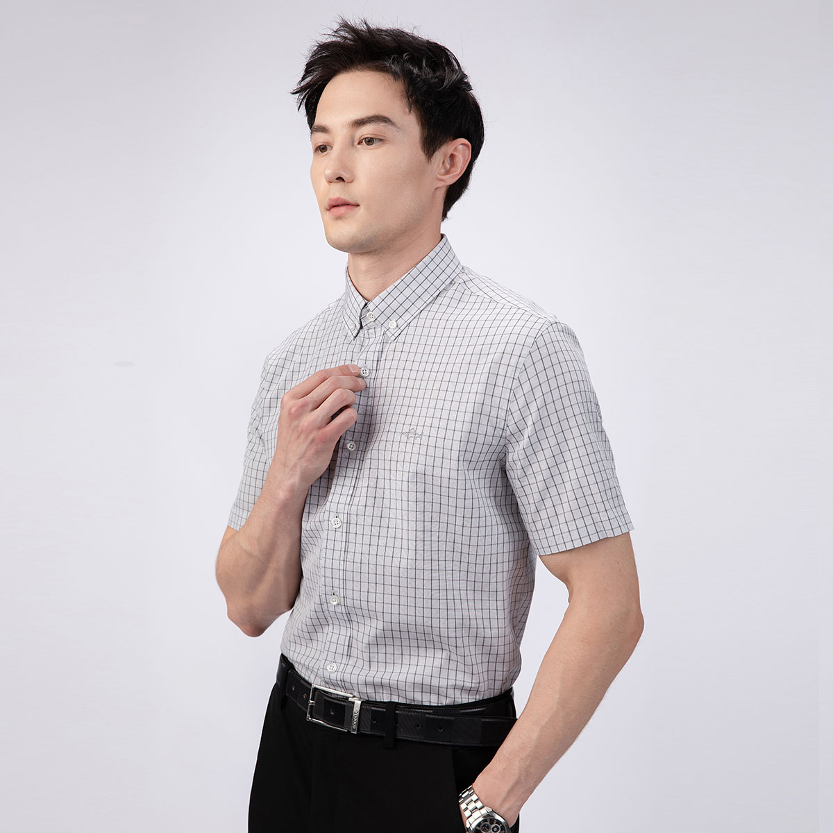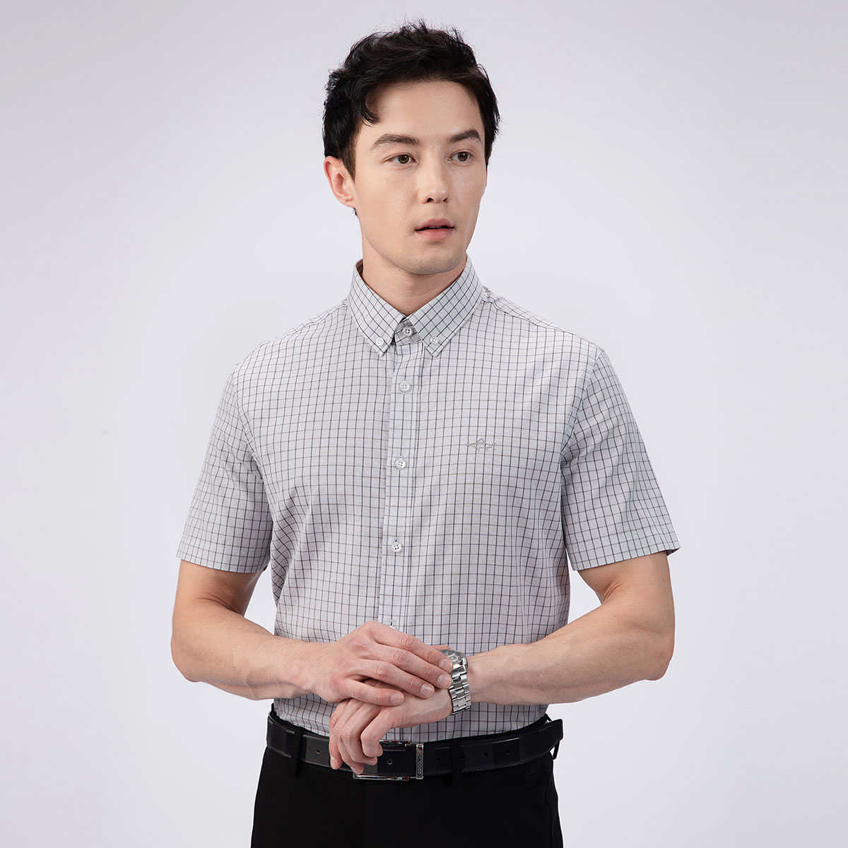 德鲨夏季纯棉短袖格子衬衫男青年时尚全棉衬衣男上衣LY21412