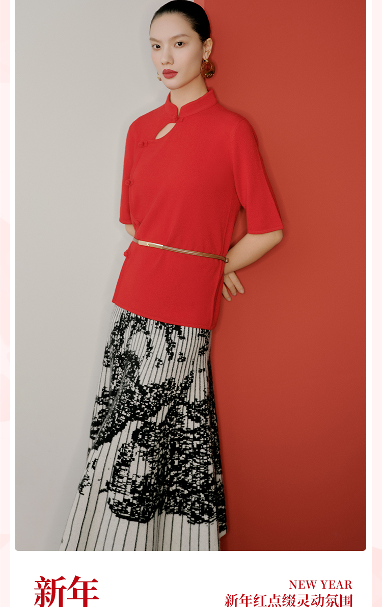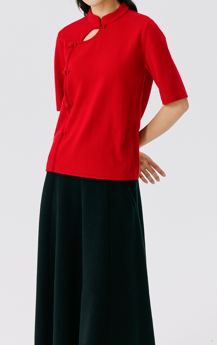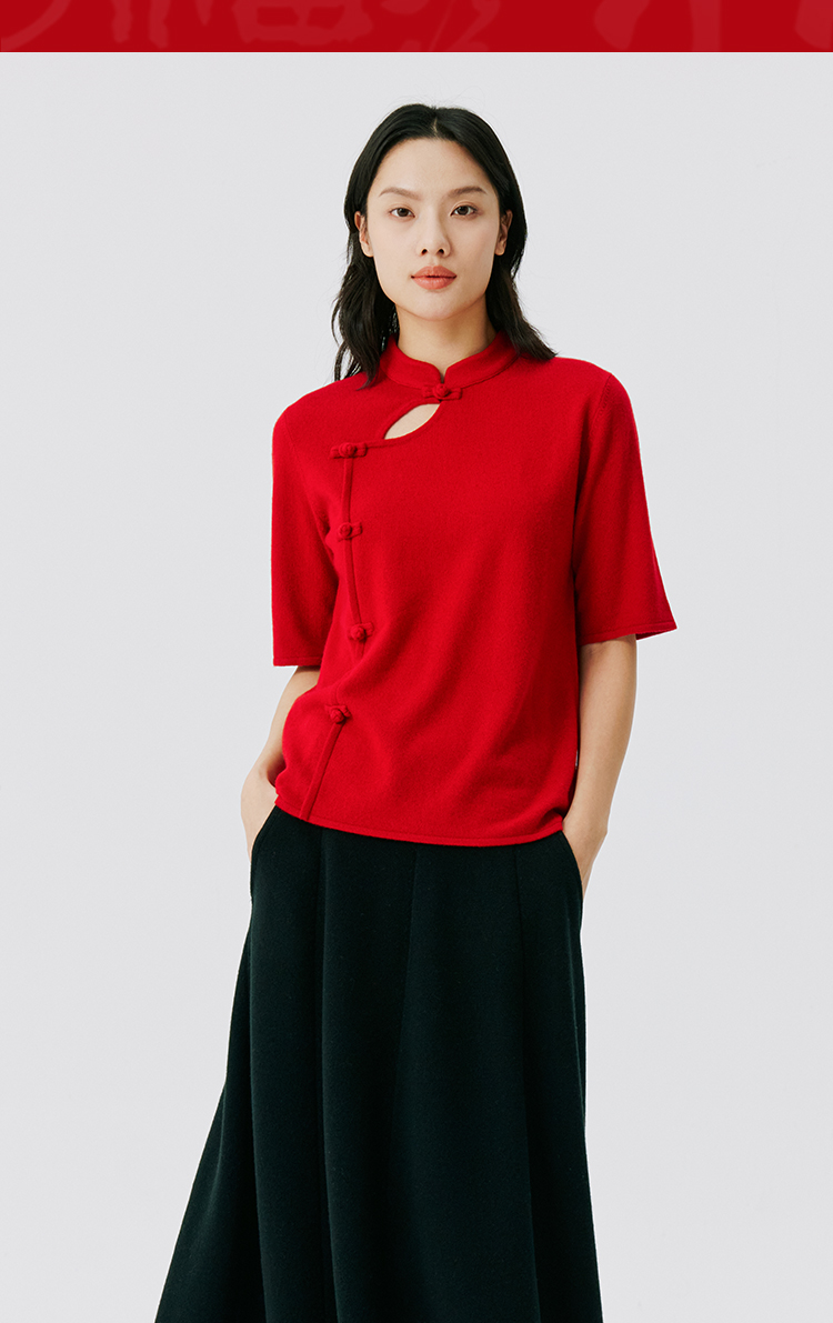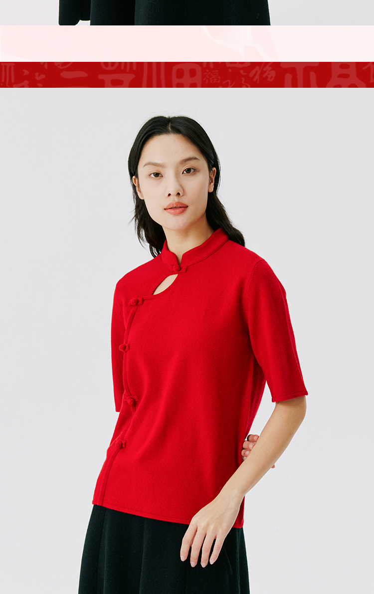 东黎 • 山羊绒 女士秋冬 新中式气质中国风红色短袖 3548