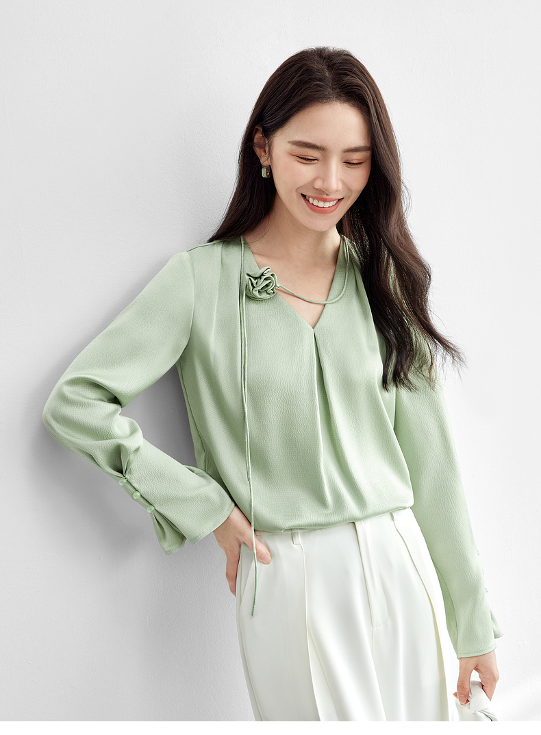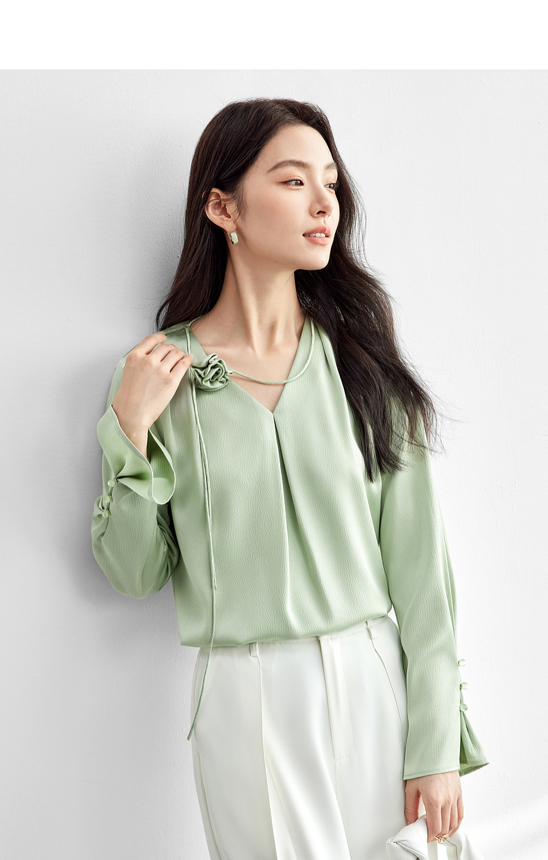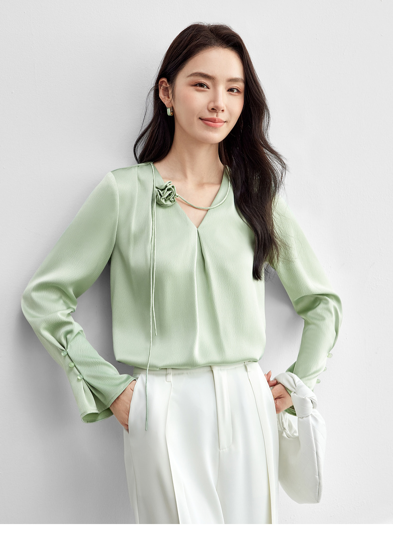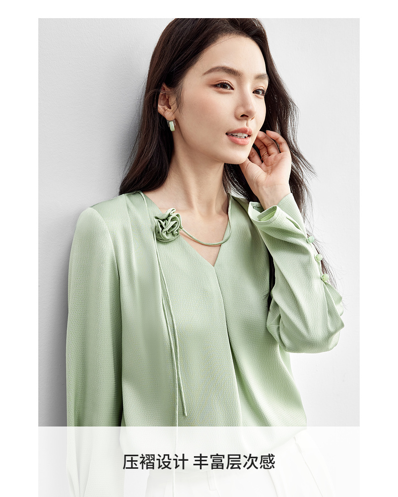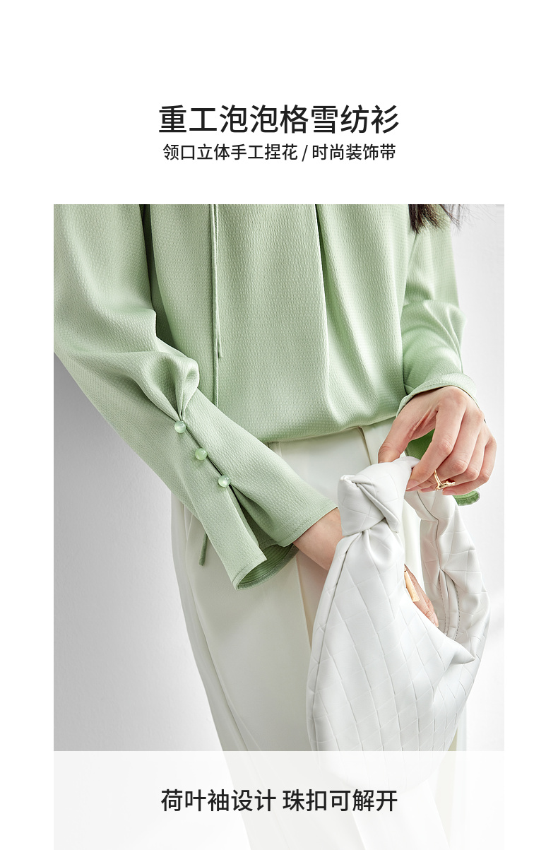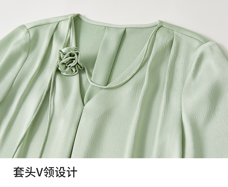 【内购】气质通勤立体手工花朵压褶设计V领荷叶袖仿醋酸泡泡格肌理雪纺衫-151V58640