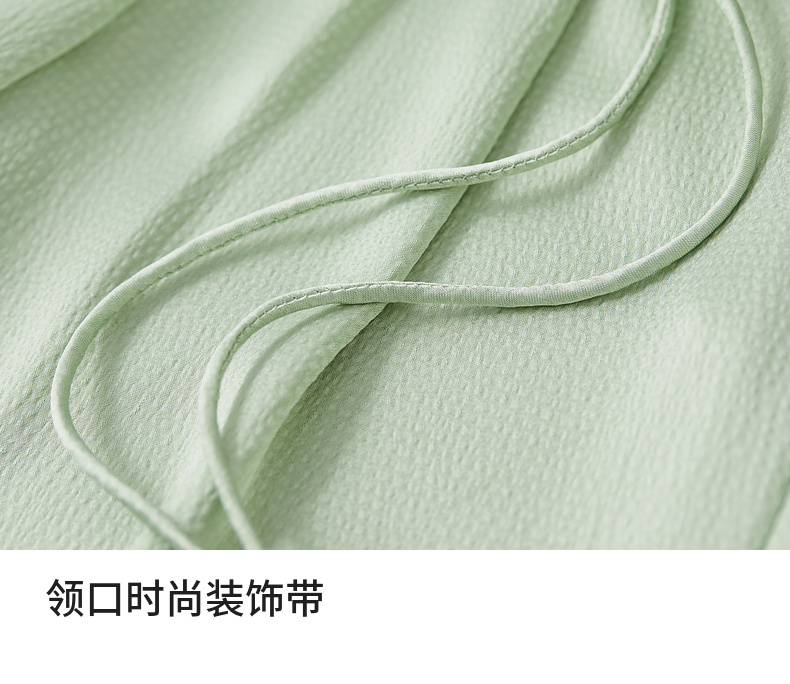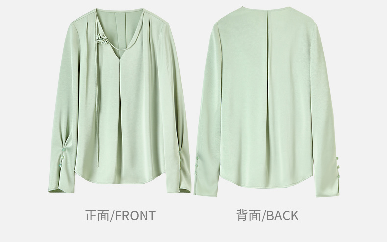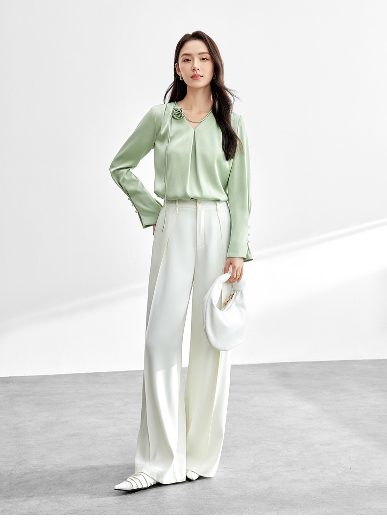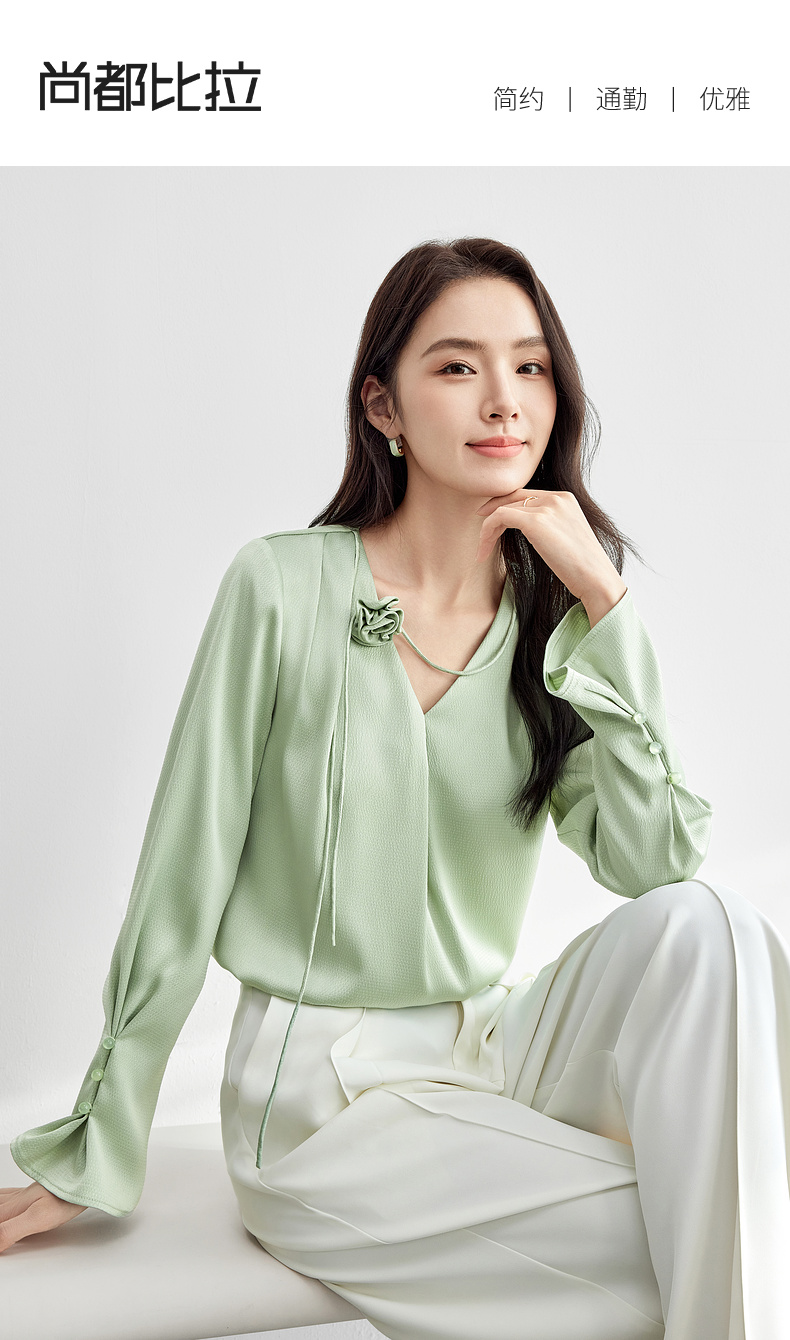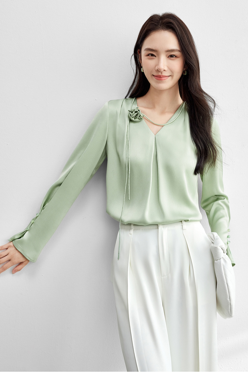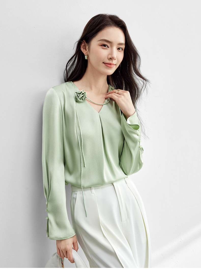 【内购】气质通勤立体手工花朵压褶设计V领荷叶袖仿醋酸泡泡格肌理雪纺衫-151V58640