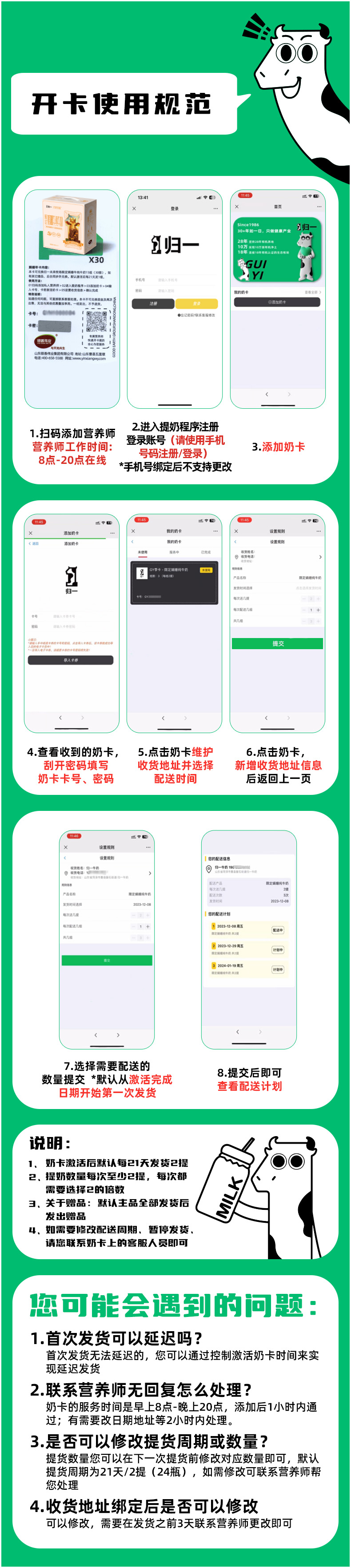 为了更好的服务客户,我们特别制定了归一牛奶套餐奶卡,所有购买牛奶套餐的客户,我们将会在48小时内给您邮寄归一专属定制奶卡,您收到奶卡后,请第一时间绑定激活,按照牛奶开卡流程进行操作(开卡流程如下图),开卡过程中有任何疑问也可咨询奶卡客服。