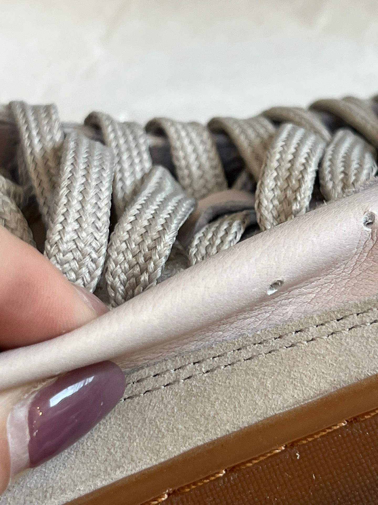 进口小牛皮+麂皮鞋面,无内里,手工鞋就是越穿越贴合,空胶工艺,现在大牌越来越喜欢用这个空胶工艺,鞋面不是开胶,而是软糯的鞋帮跟柔韧的大底,都是手工缝线,不需要用胶水,脚感更加软糯随性。