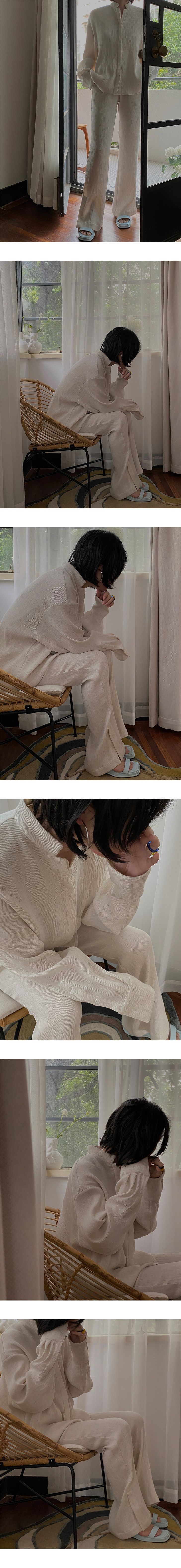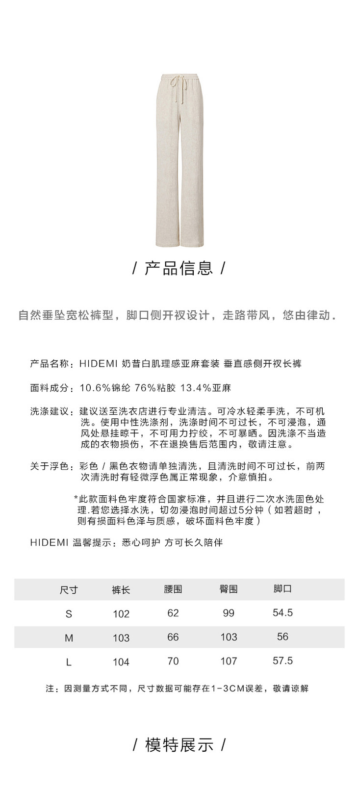 HIDEMI 懒人必备/奶昔白肌理感亚麻套装 圆领衬衫/垂直感侧开衩长裤