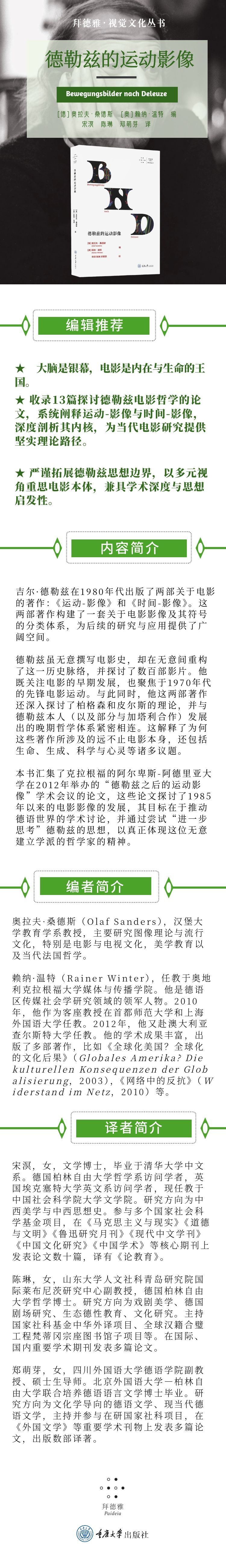 同时——我们乍看、粗看并最终错看的一个矛盾之处在于——德勒兹论电影的著作即便在出版三十年之后也几乎没有或尚未被恰当地接纳,这一方面是因为这些著作本身的难度。德勒兹的这些著作并不比他的其他著作——诸如《感觉的逻辑》(Die Logik des Sinns, 1993),或有关莱布尼茨和巴洛克的《褶子》(Die Falte, 1995)——更易读。另一方面是因为这些著作与德勒兹和加塔利的哲学也有着千丝万缕的联系。因此,本书还意在追问,德勒兹之后的运动影像是否已能全然地在德勒兹的概念高度上得到阐明和理解,他总是想将这些概念用作理解电影的术语。本书中的文章有些带有强烈的德勒兹色彩,有些则侧重于科学溯源式的目标。在这本汇集了大量文章的文集中,不同的学科和不同的德勒兹主义交错穿插,千头万绪。德勒兹和加塔利在其他著作中的概念也将不断被回溯,这将使得我们有可能对电影中的运动影像进行不同的分析。