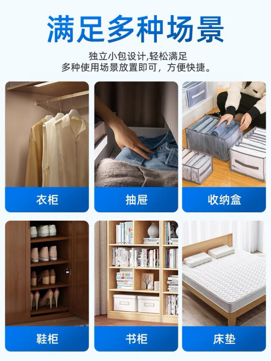 一般适用于卧室、母婴房、衣柜、鞋柜等 空间内的抽屉和收纳盒。可放置于衣帽间、压缩袋、衣柜、储物箱、鞋柜、书柜、抽屉和乐器等地方。