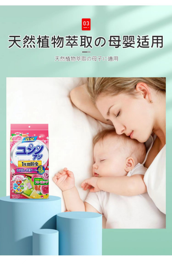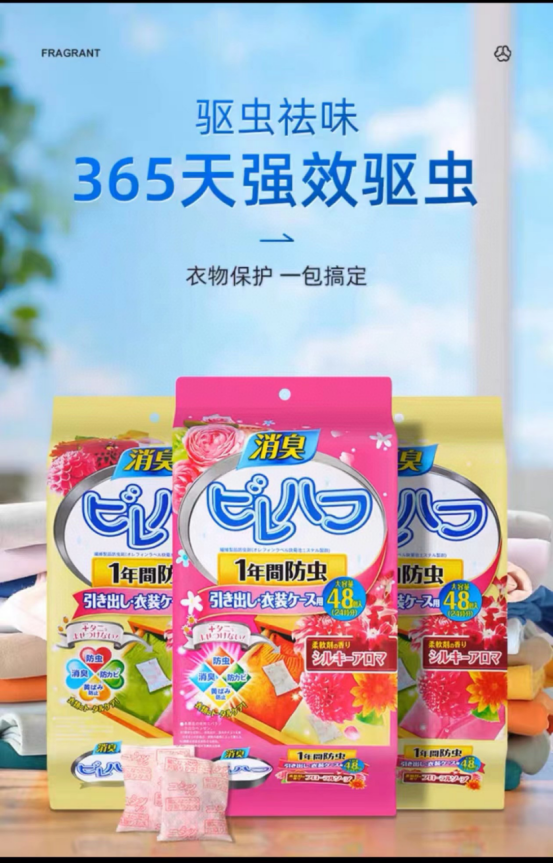 主要特点: 一般一个抽屉放1-2颗 大收纳袋的话2-4颗就可以了 一盒48粒。很省很方便。 功效: 一:环保材质,无樟脑呛人气味 对人身体无刺激无伤害 即使有宝宝的家庭可以使用 二:有效成分迅速扩散 防虫蛀防霉效果很好 贵重的羊毛,皮具,真丝也可以用哦。 三:含消臭成分 防止衣服吸付难闻的气味,保持清新香味 四:衣物变黄是因为空气中的NOx酸化物,有效成分中有专门吸付NOx酸化物的微粒子,有效的防止衣物发黄 温馨提醒: 使用时间长达1年,不过会以湿度 收纳容器大小及使用状态而有所变化 从原本的 粉色变为紫色时,就要更换新的啦照‼