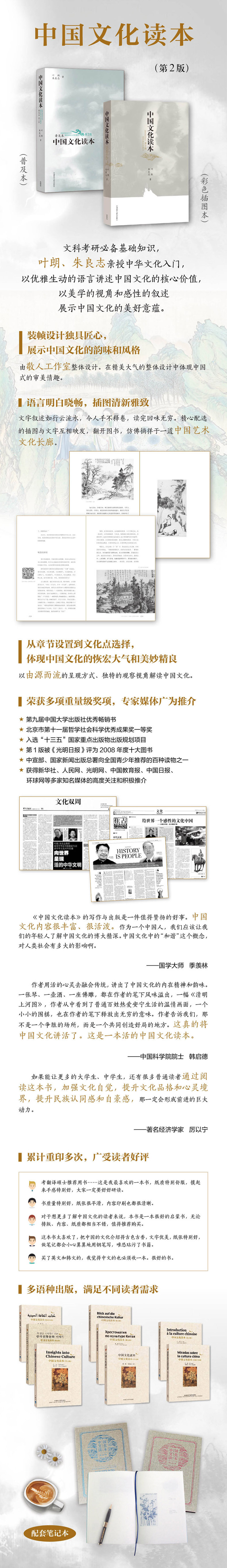 《中国文化读本》由北京大学哲学系教授叶朗、朱良志合著。作者摒弃了以往介绍中国文化书籍面面俱到或过于专业的写作方式,而是力图以小见大,把中国文化的感性内容与思想深度结合起来。作者叶朗表示,目前国际社会非常关注中国,但很多西方国家的公众对中国文化的了解还停留在17、18世纪传教士介绍的水平上;还有一些人出于种种原因,头脑中存在着对中国文化的片面歪曲认识,这种文化上的隔膜和曲解亟待改变,这也是在奥运前推出该书的主要目的。 ——人民日报2008年6月19日报道节选