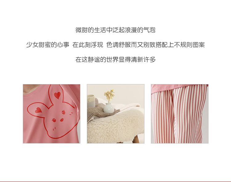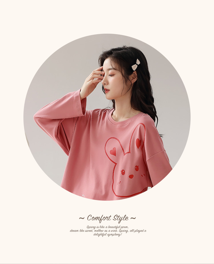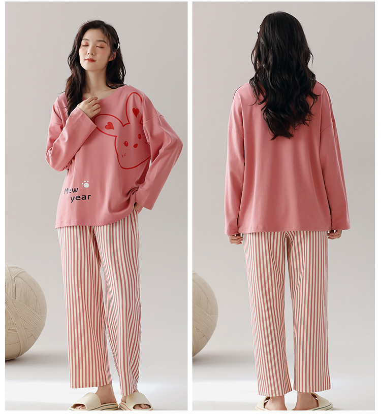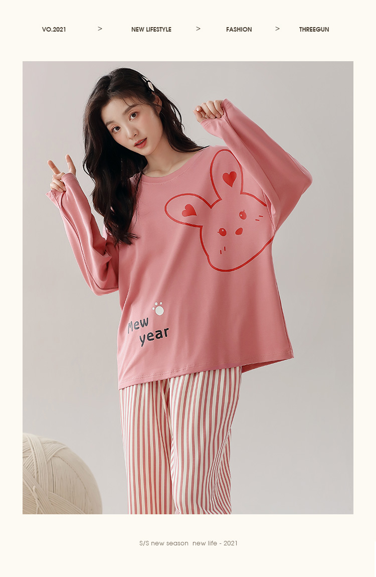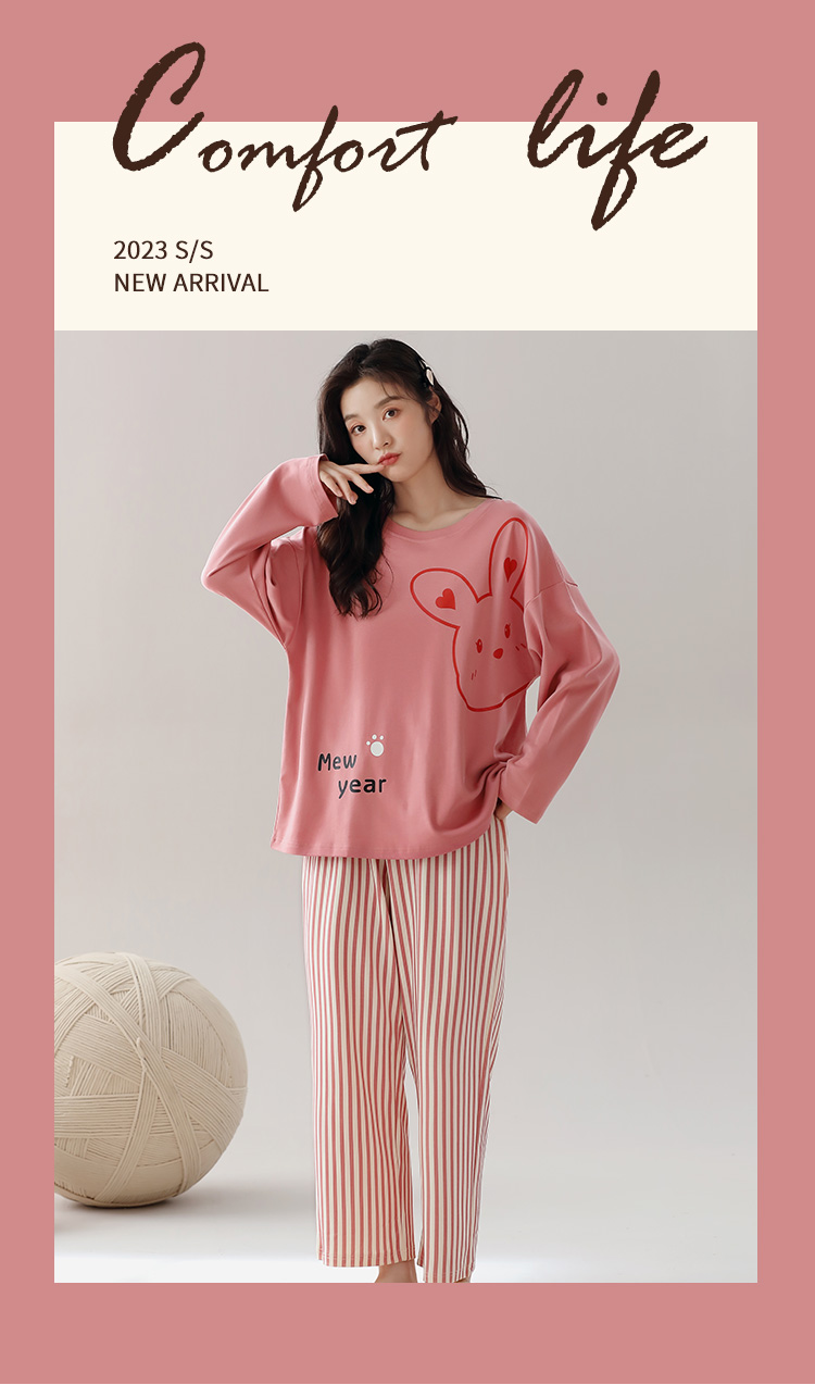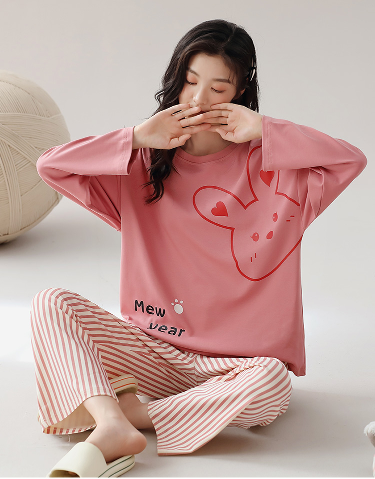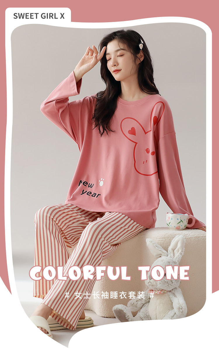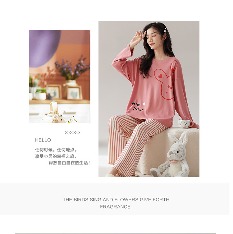 洁丽雅棉质女士大码圆领家居服个性印花舒适亲肤长袖长裤套装