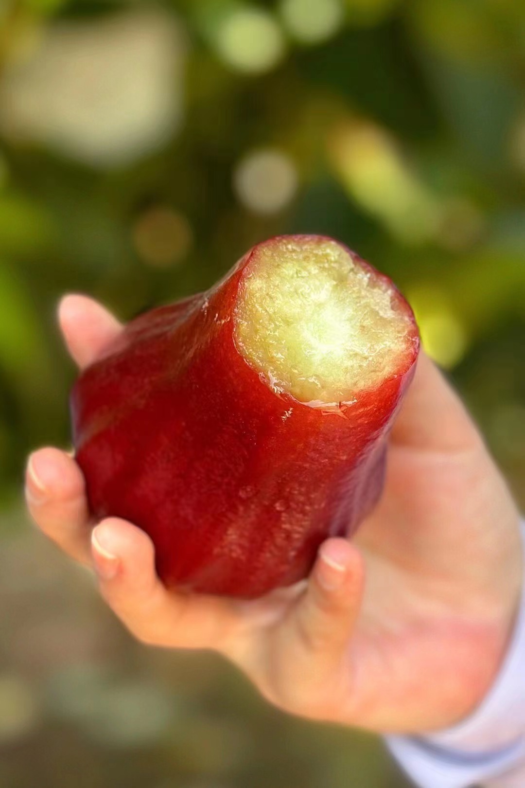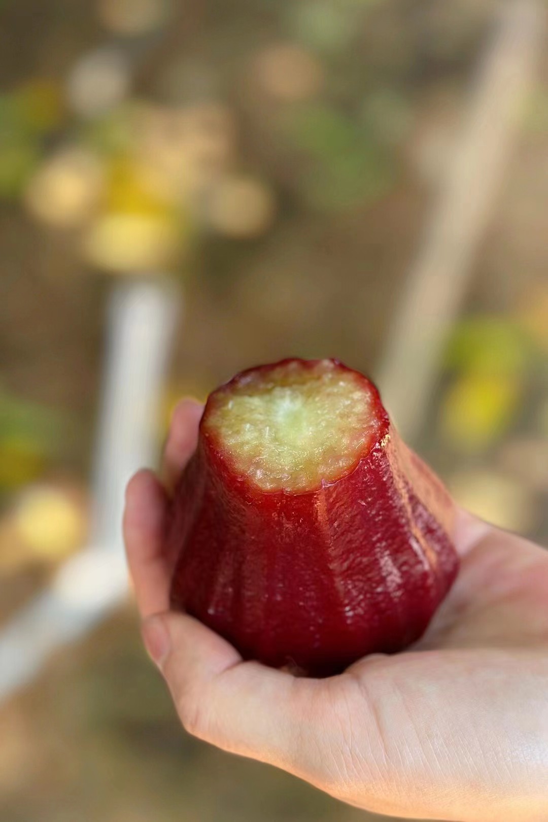 这里平均气温比万宁、三亚以及琼海等以往专业莲雾产区高出5℃, 所以这里的莲雾比其他甜度高 我们果园的莲雾树都是十年的老树 ,老树果子风味更丰富,滋味更浓郁,一点也不滑淡 甚至莲雾中间的海绵体都更加的少 每一颗莲雾都甘甜怡人,鲜嫩多汁。
