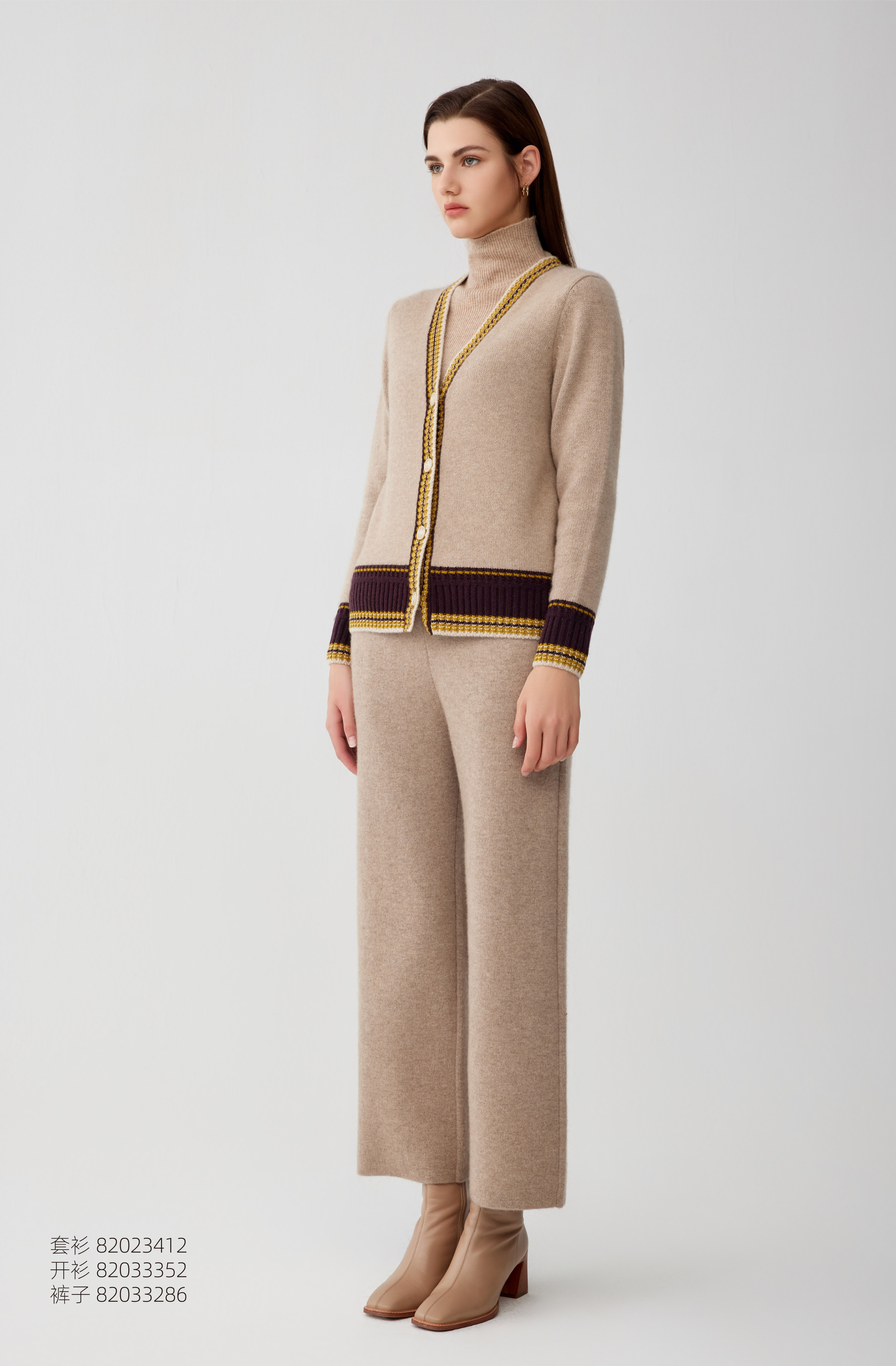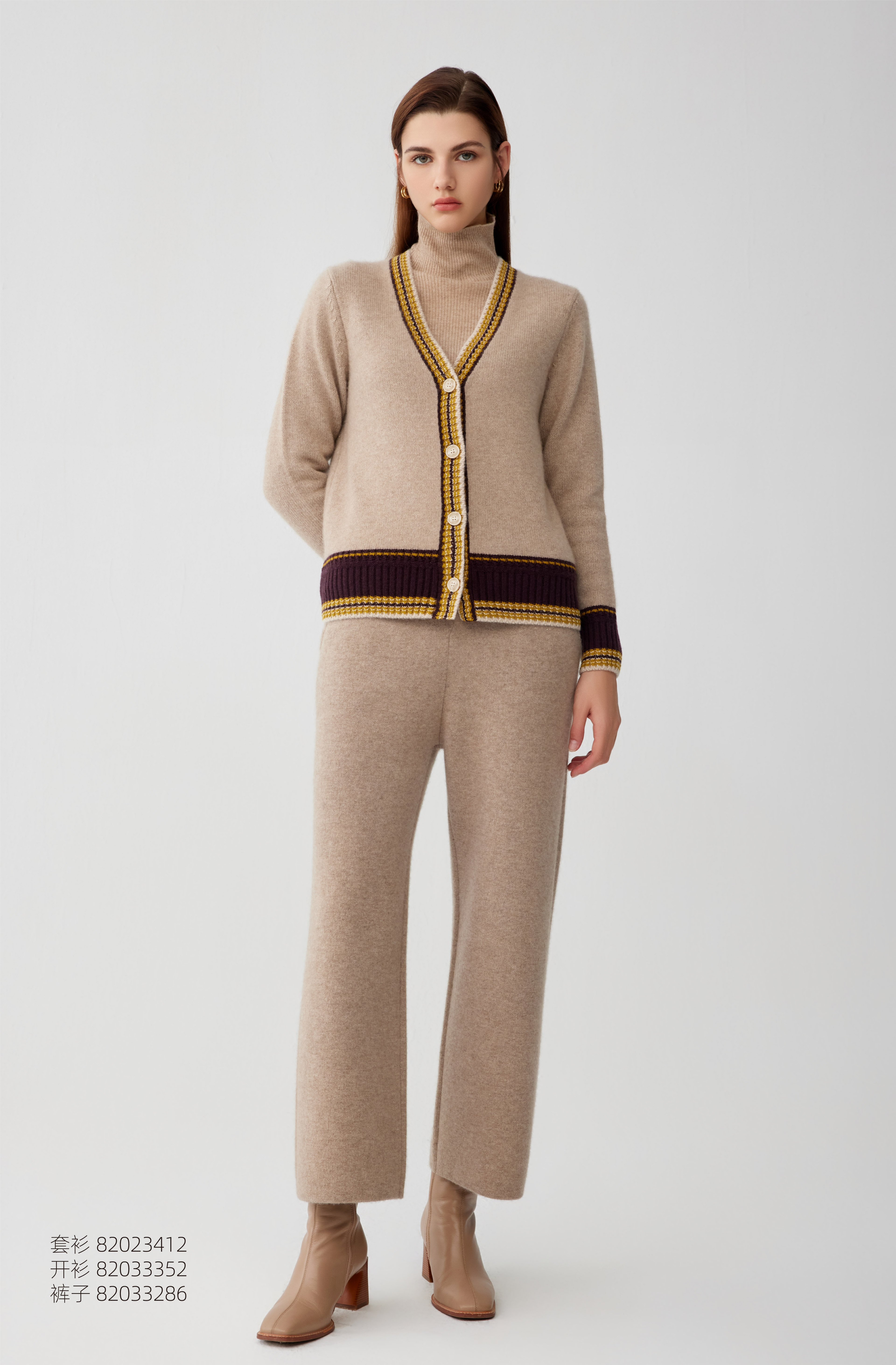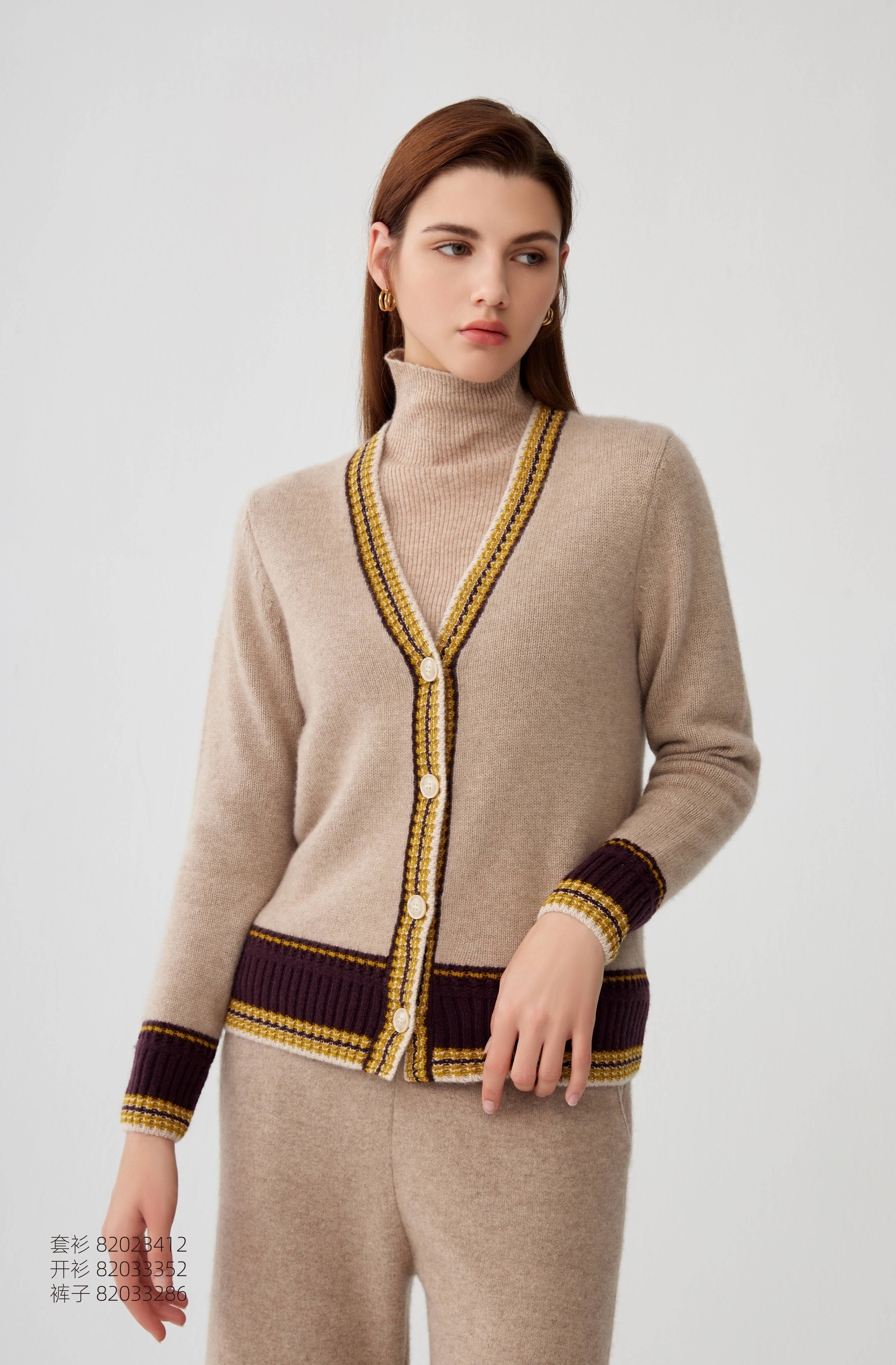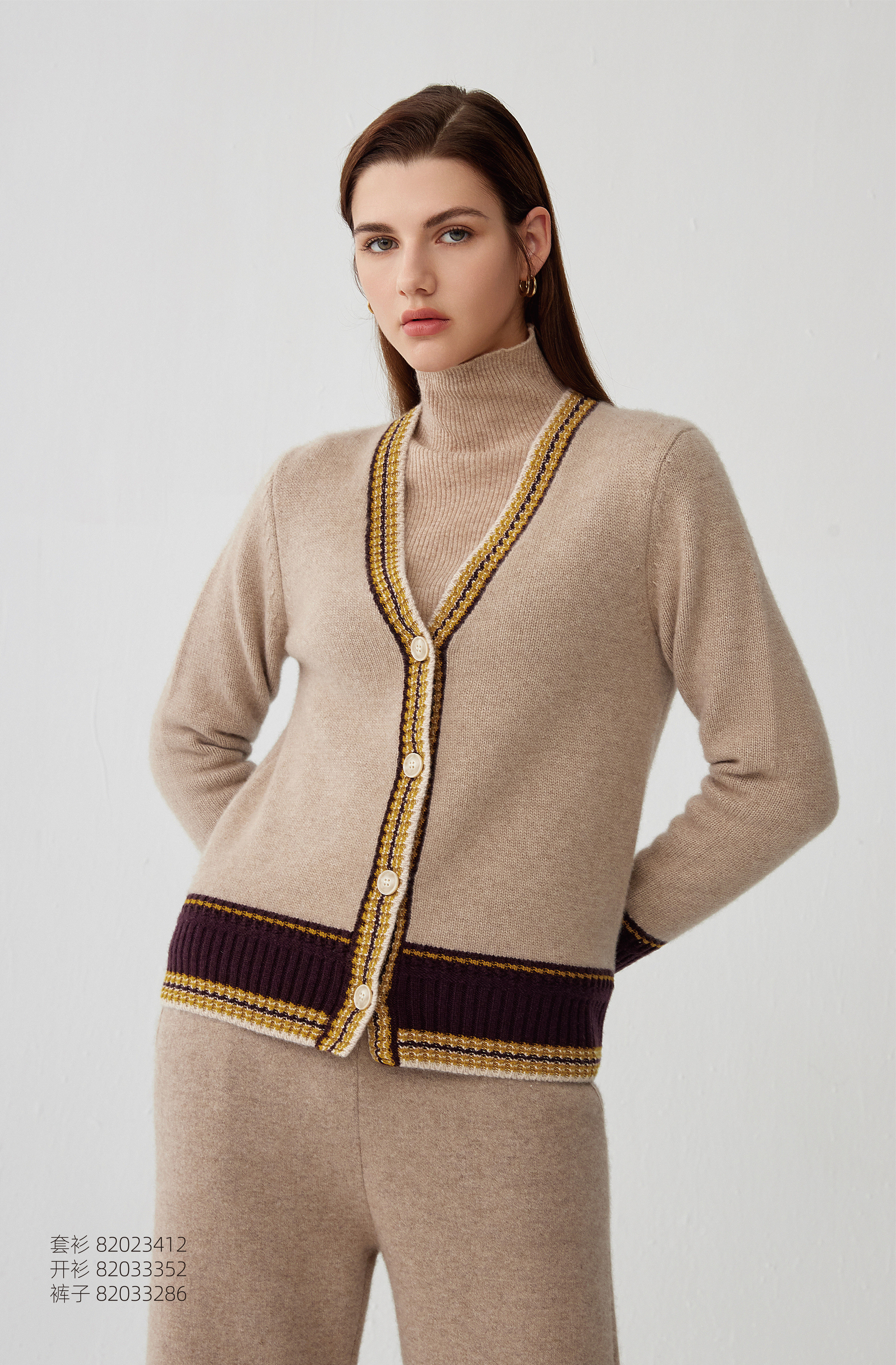 【V领撞色针织开衫】羊绒世家秋冬新品100%山羊绒衫时尚撞色针织保暖外套