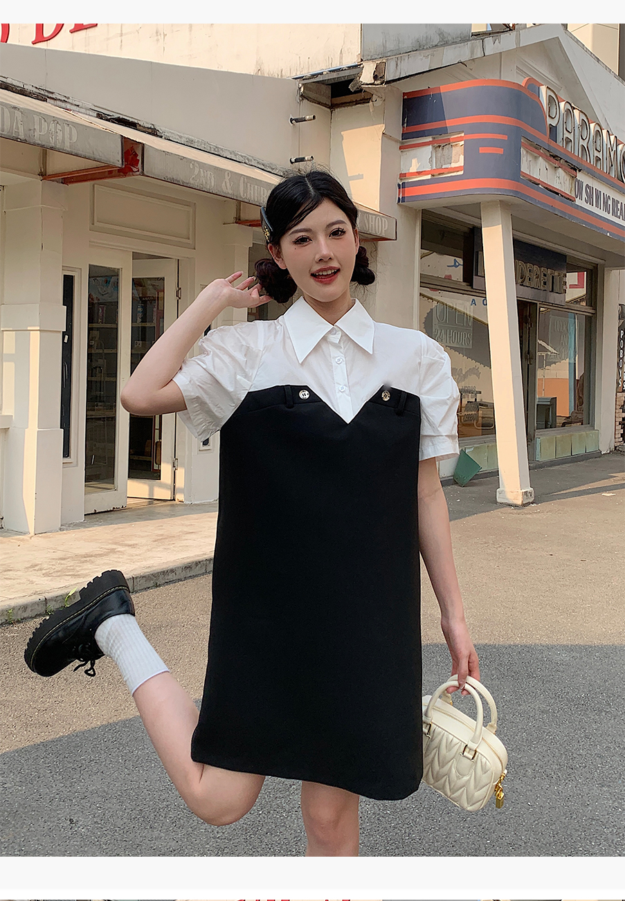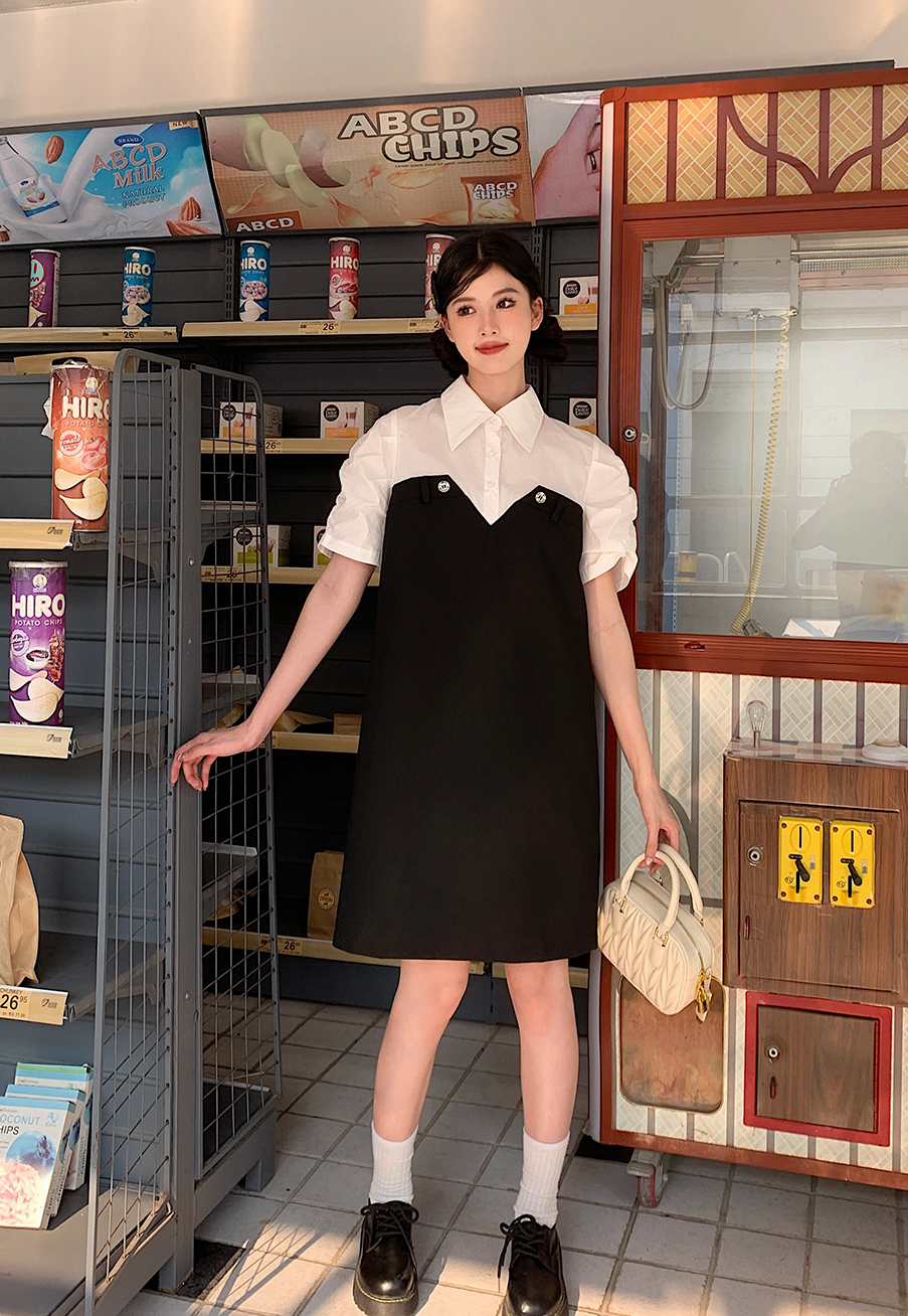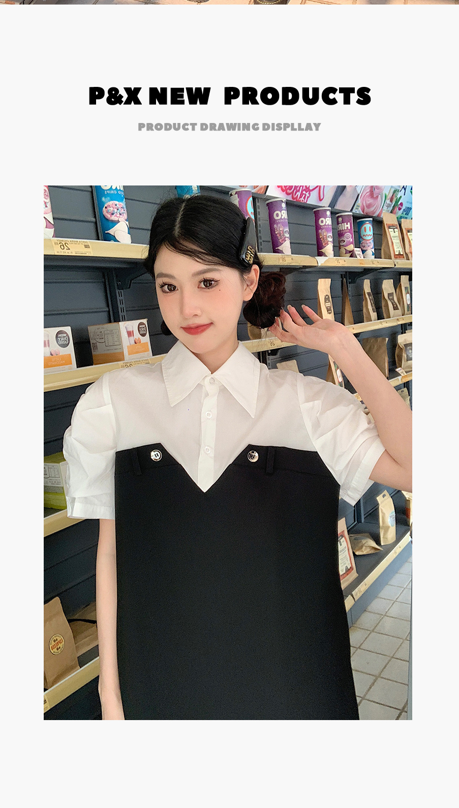 P&X设计师女装夏季宽松娃娃领拼接连衣短裙 824208265 黑/白