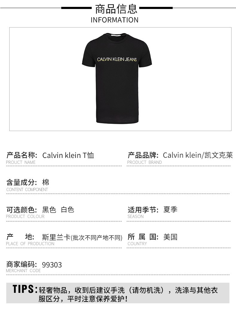 凯文克莱(Calvin Klein)CK男装 男士圆领短袖字母T恤 99303