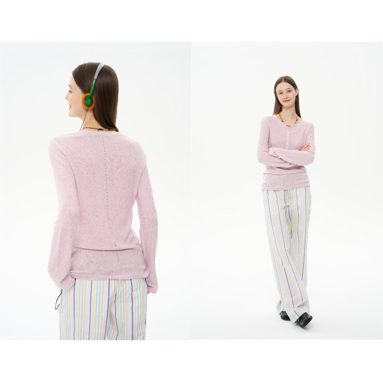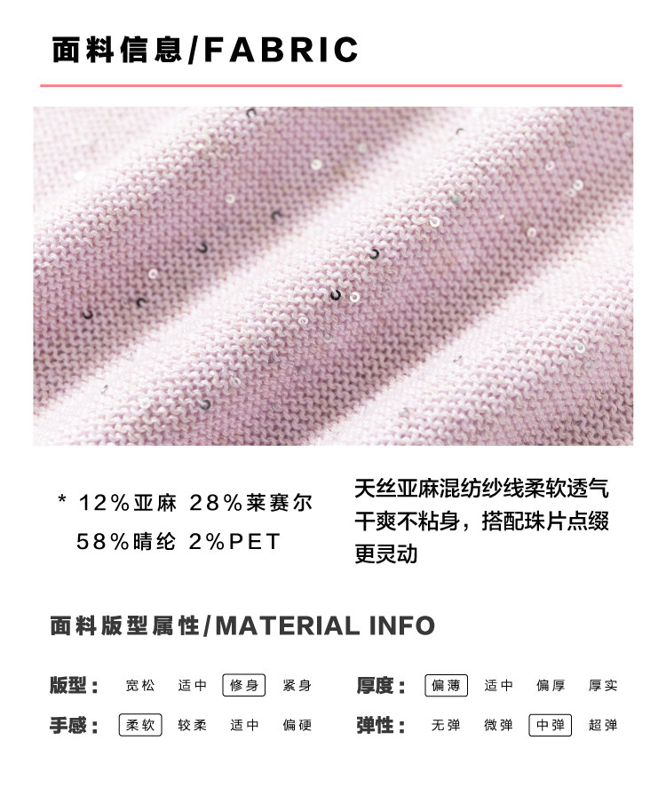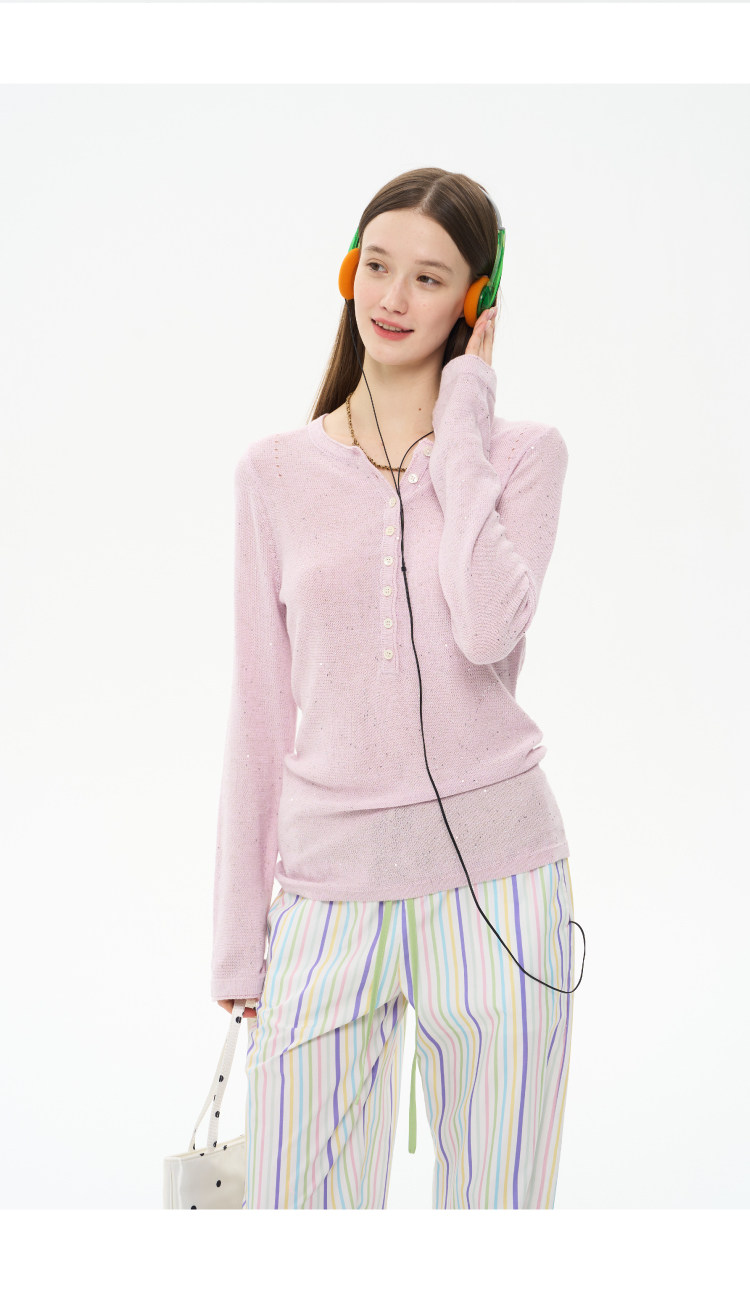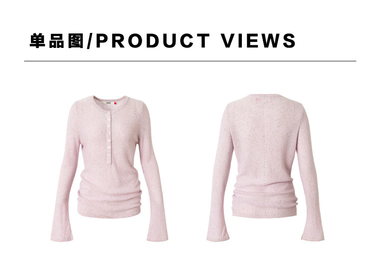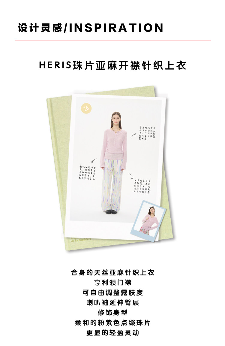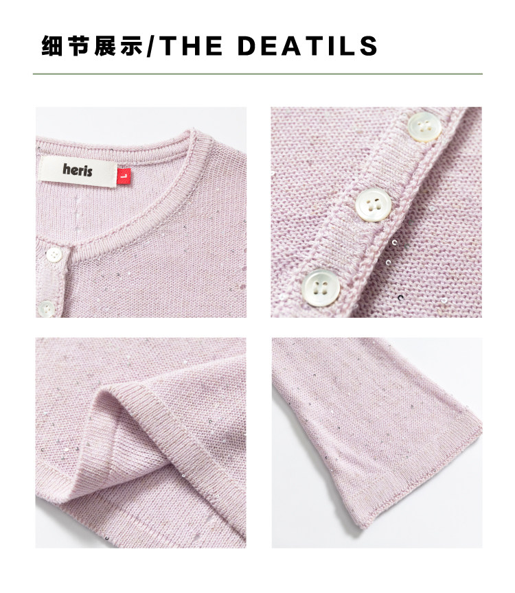 heris/H61104/珠片亚麻花纱针织 亨利领开襟 喇叭袖针织显瘦上衣春夏