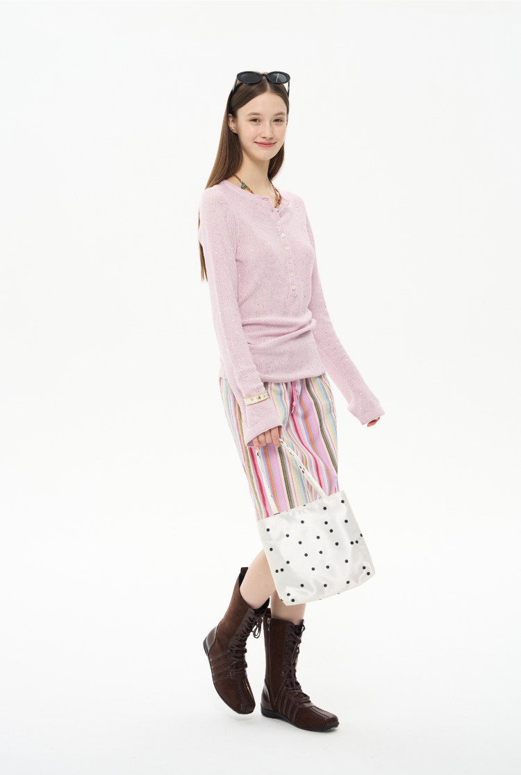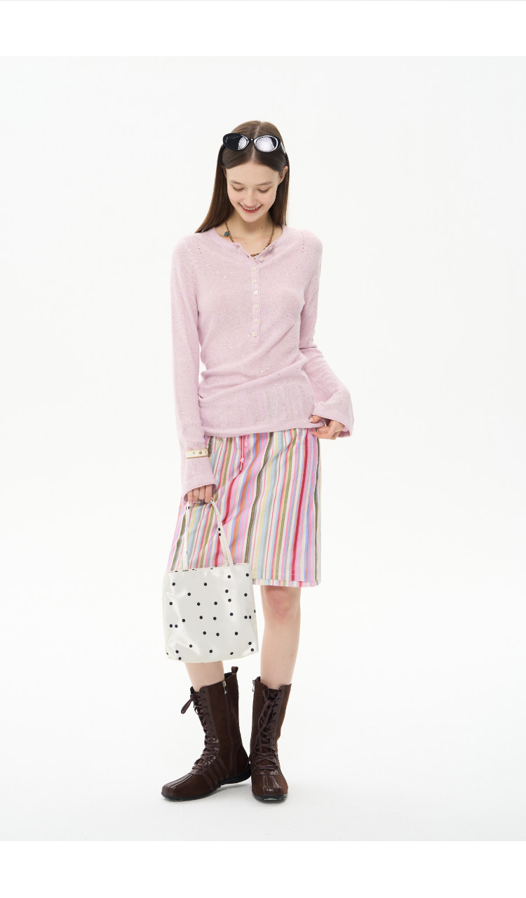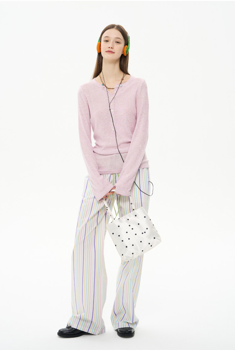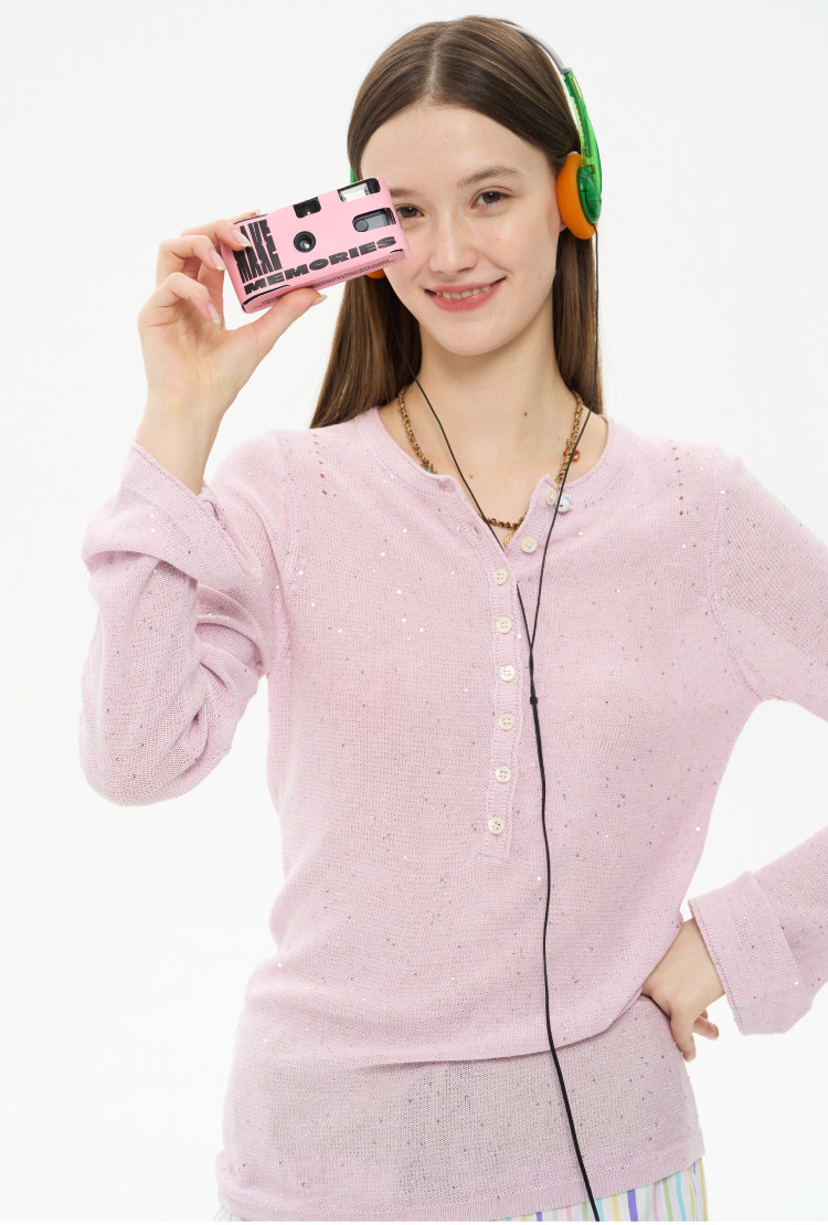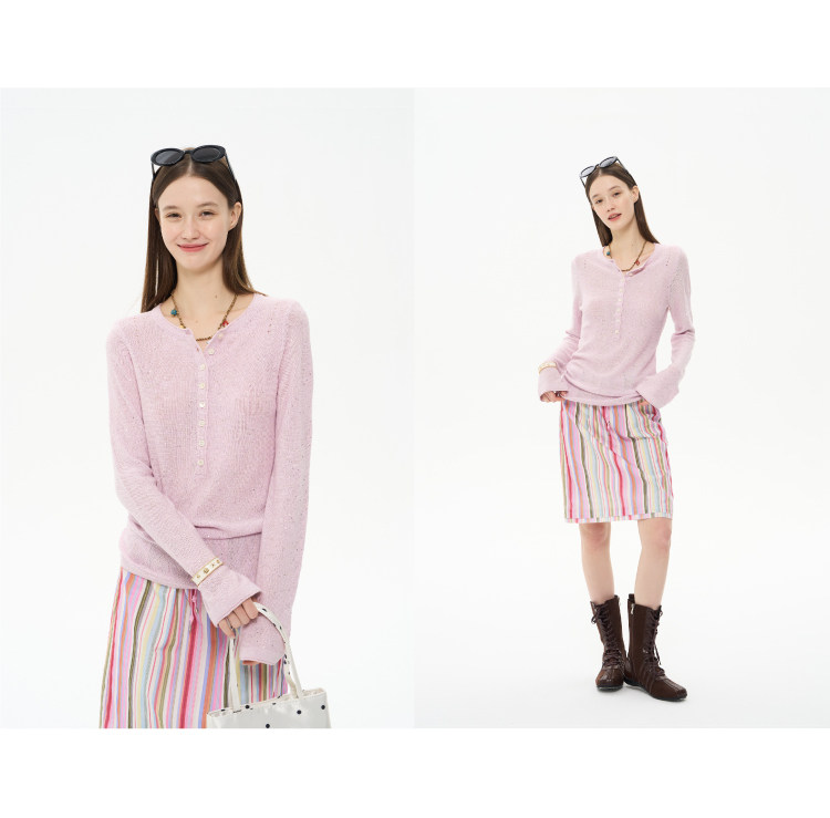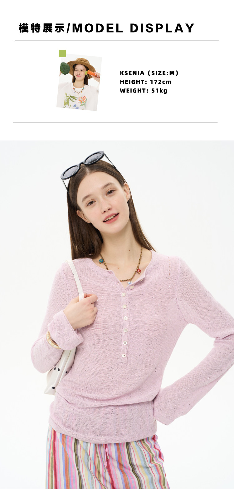 heris/H61104/珠片亚麻花纱针织 亨利领开襟 喇叭袖针织显瘦上衣春夏