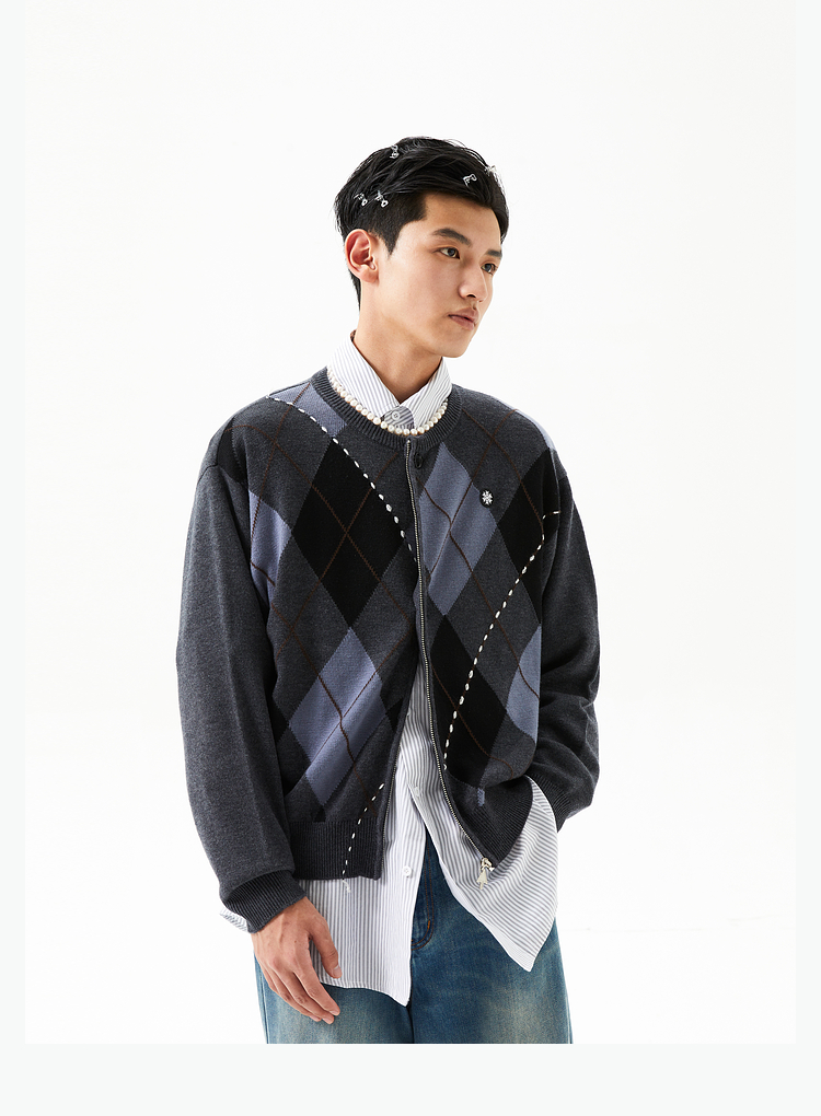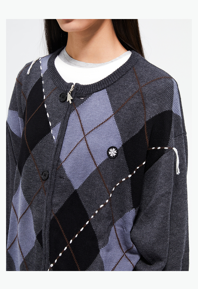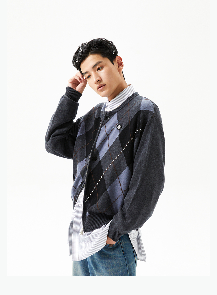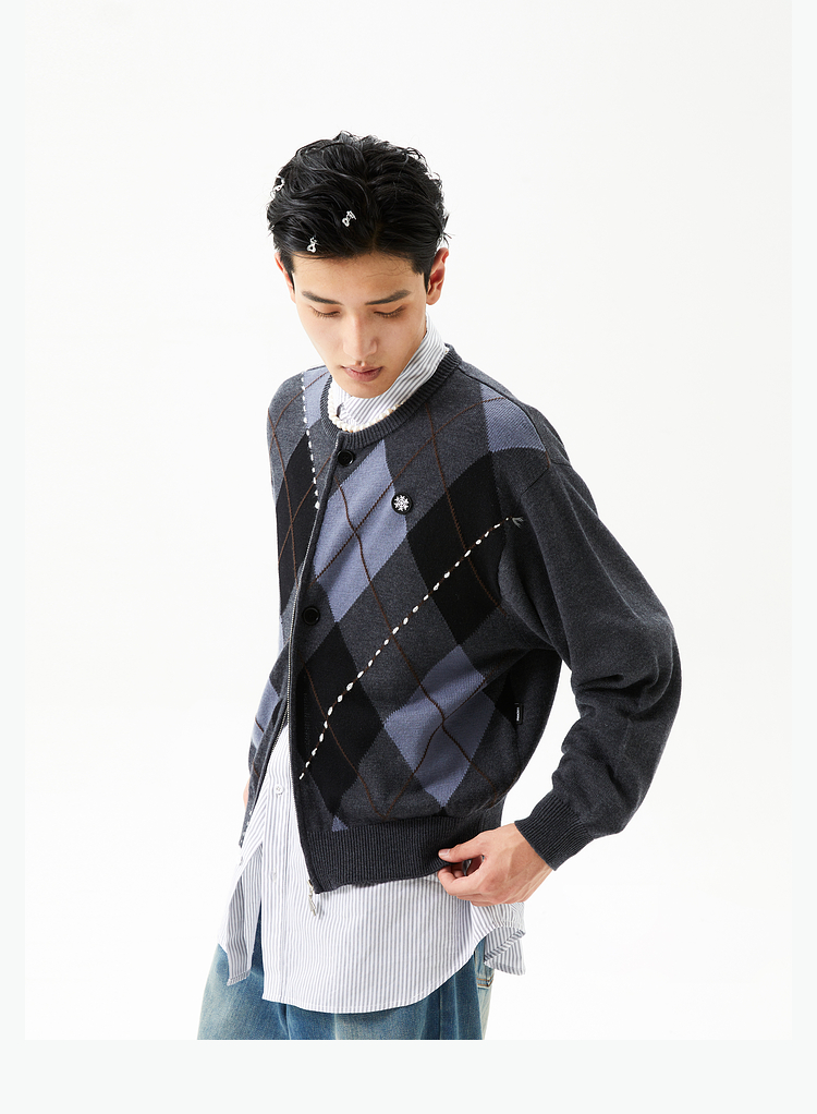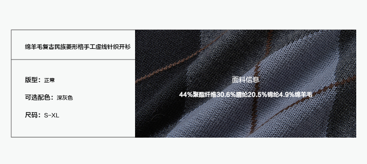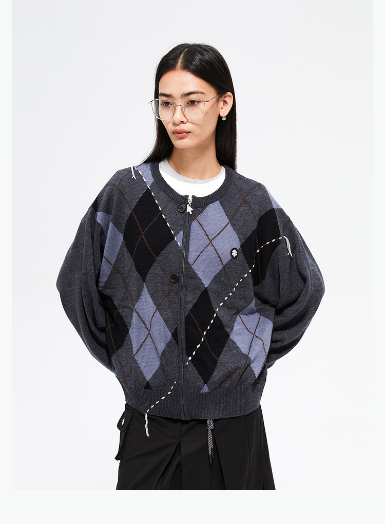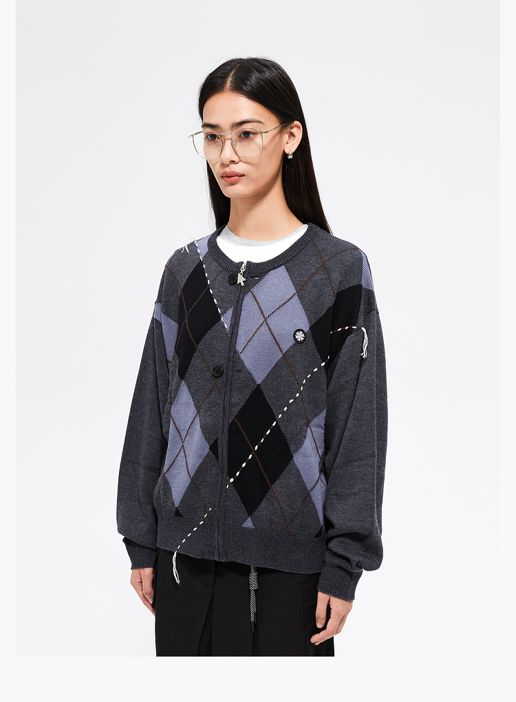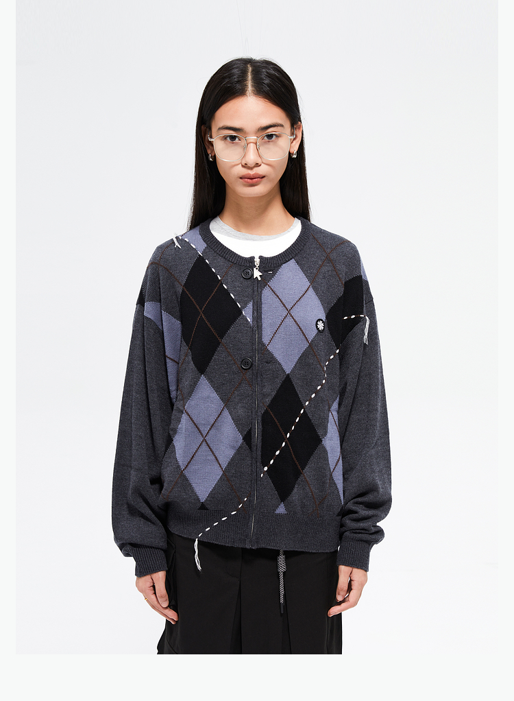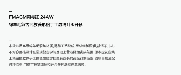 FMACM/ZZS2411/复古民族菱形格手工虚线街头针织开衫