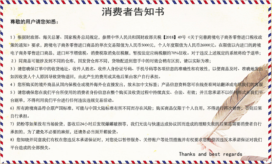 海关审核 需要收件人信息和身份证一一对应才能保证顺利清关,如果没有留真实信息可能造成清关失败,我们会与收件人核对,核对失败一律按照跨境委托代购模式发货,请知晓。