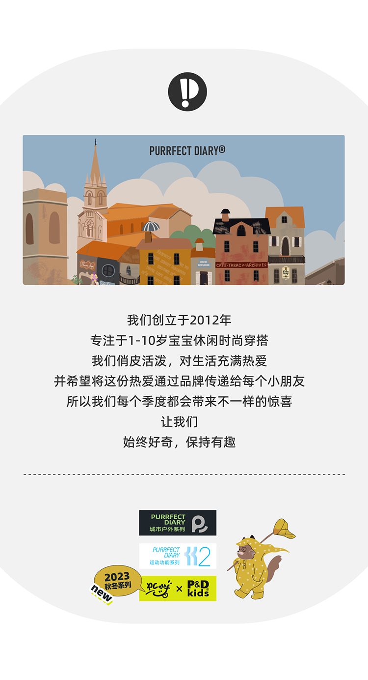 - Purrfect-Diary专注于贴近自然随性的穿着概念,轻奢平价的童装文化传播,在产品设计上更加注重婴童穿着的舒适性、安全性、更出众的国际化品牌,将欧美的育婴文化在中国进行深入的传播与推广。