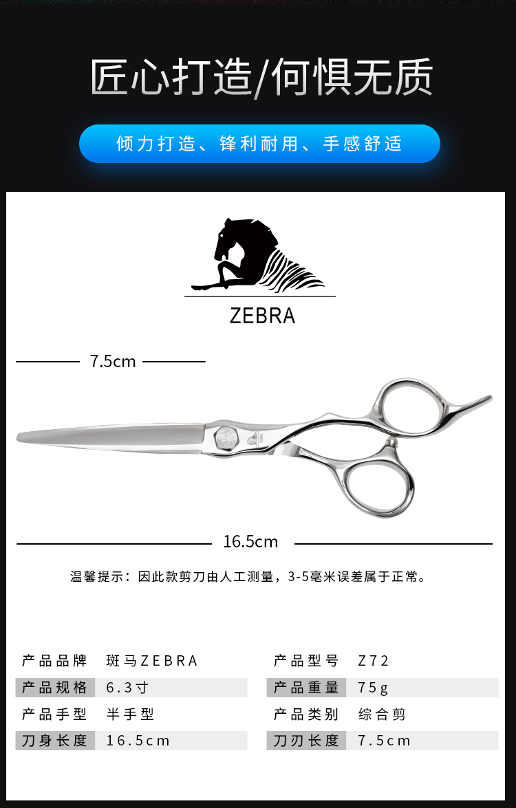 ZEBRA斑马剪刀 Z72 综合剪锋利/直发/刘海/修饰/大发片/半手型/平剪/修饰/6.3寸