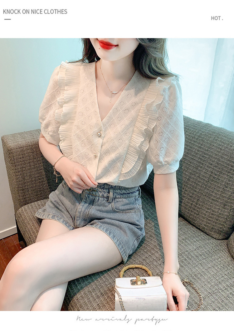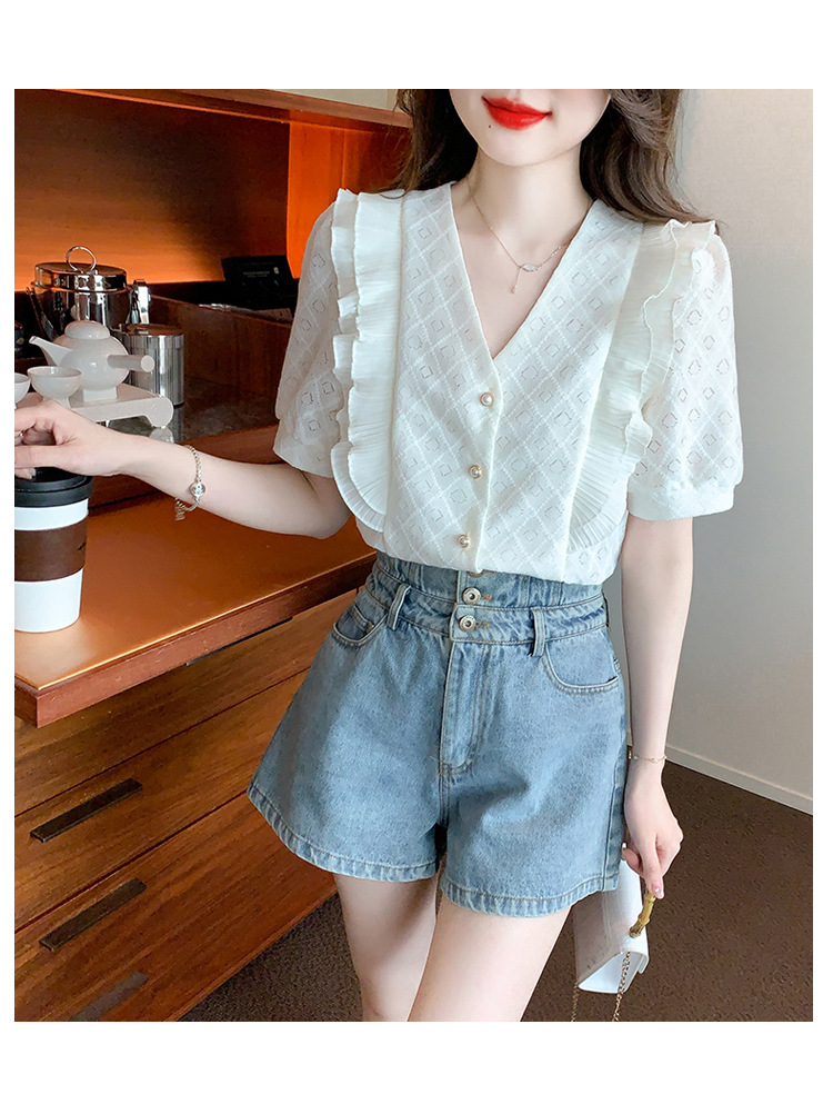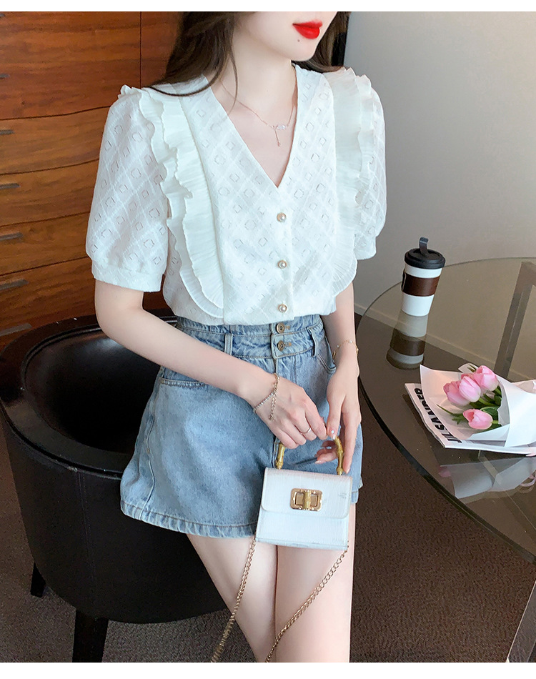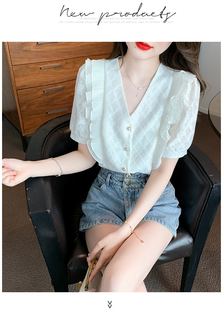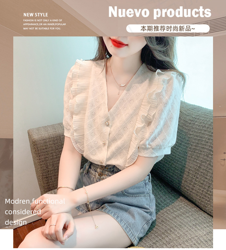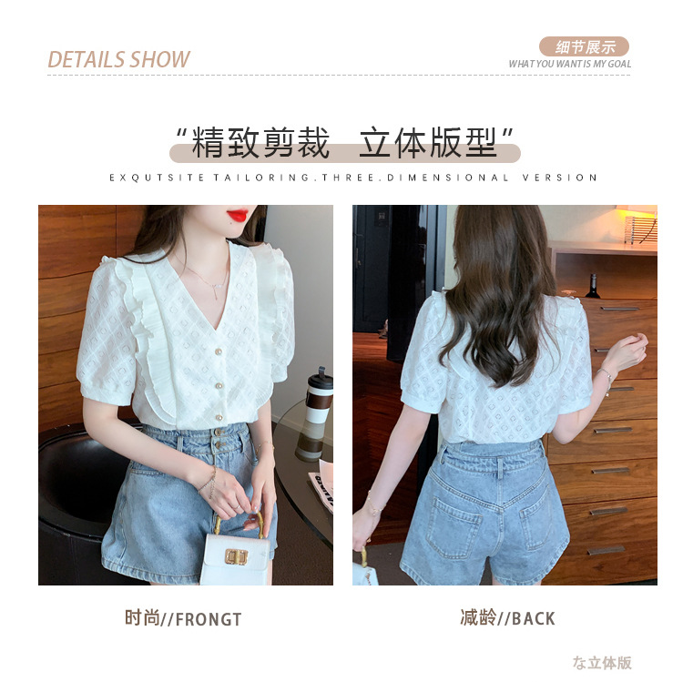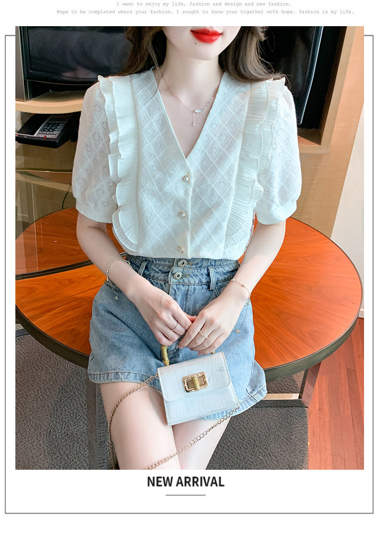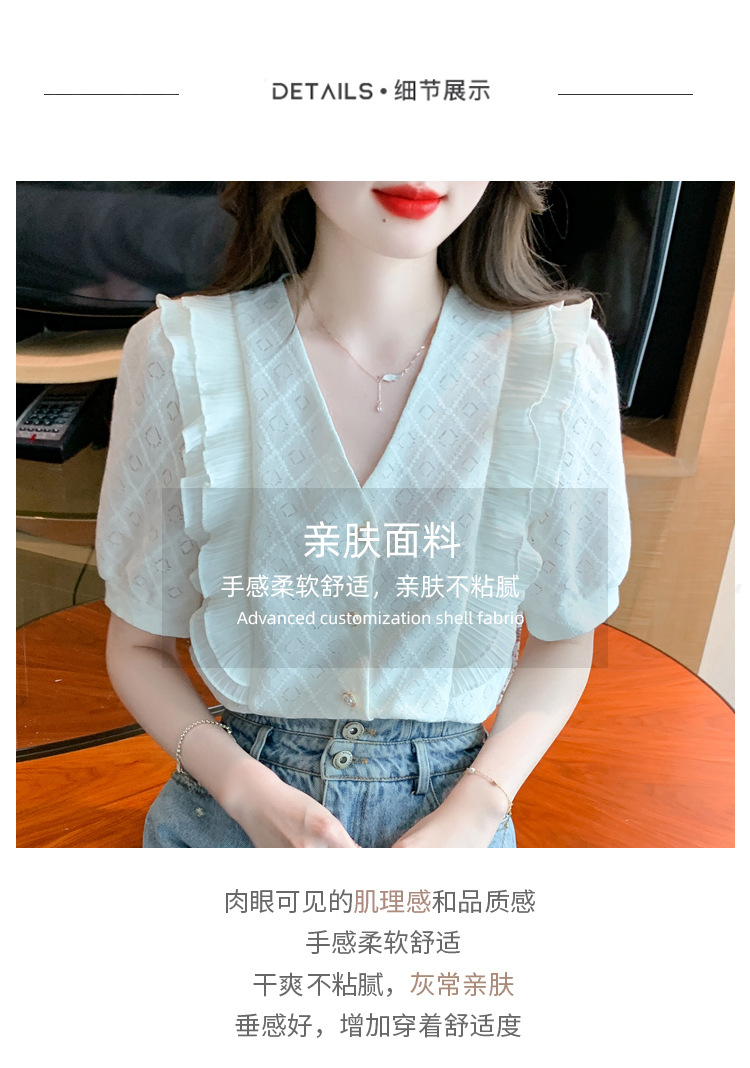 韩版百搭V领拼接短袖衬衫女,夏季新款小众设计感减龄通勤上衣AHM-DU9019-1