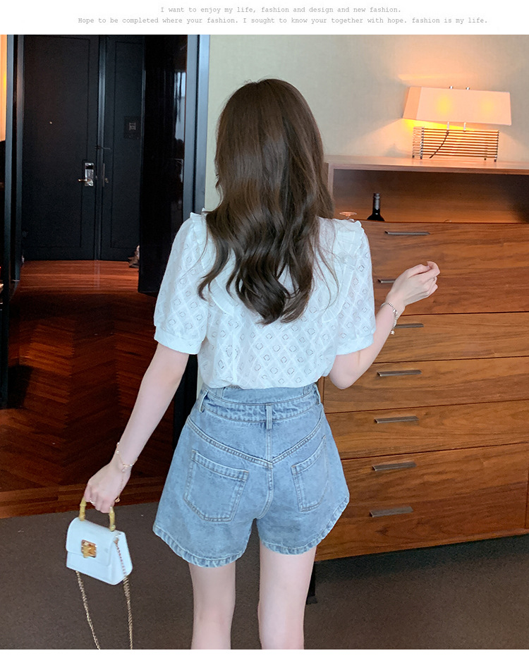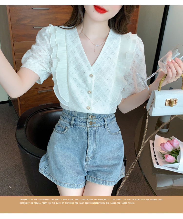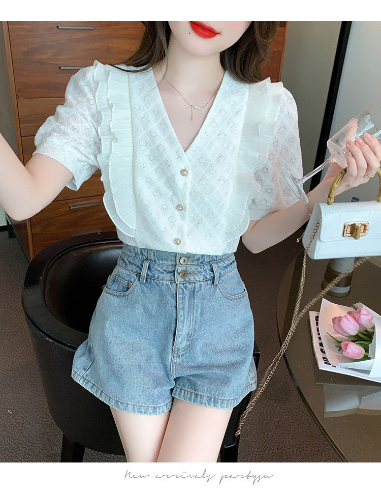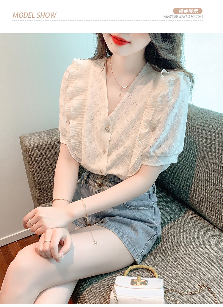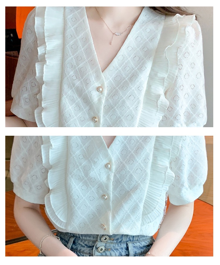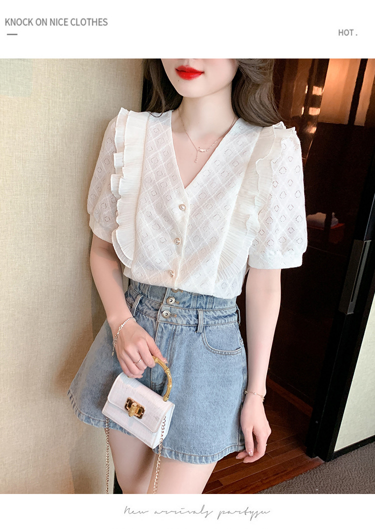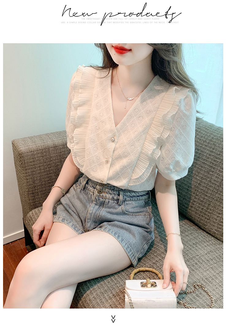 韩版百搭V领拼接短袖衬衫女,夏季新款小众设计感减龄通勤上衣AHM-DU9019-1