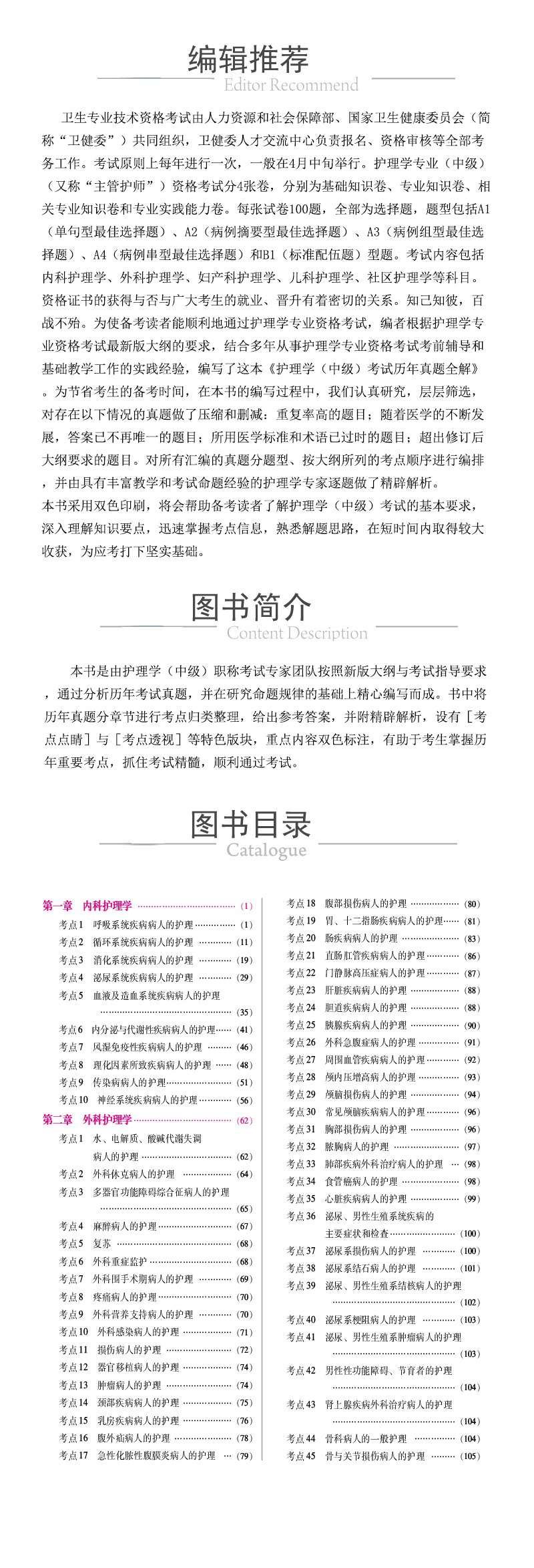 本书是由护理学(中级)职称考试专家团队按照新版大纲与考试指导要求,通过分析历年考试真题,并在研究命题规律的基础上精心编写而成。书中将历年真题分章节进行考点归类整理,给出参考答案,并附精辟解析,设有[考点点睛]与[考点透视]等特色版块,重点内容双色标注,有助于考生掌握历年重要考点,抓住考试精髓,顺利通过考试。