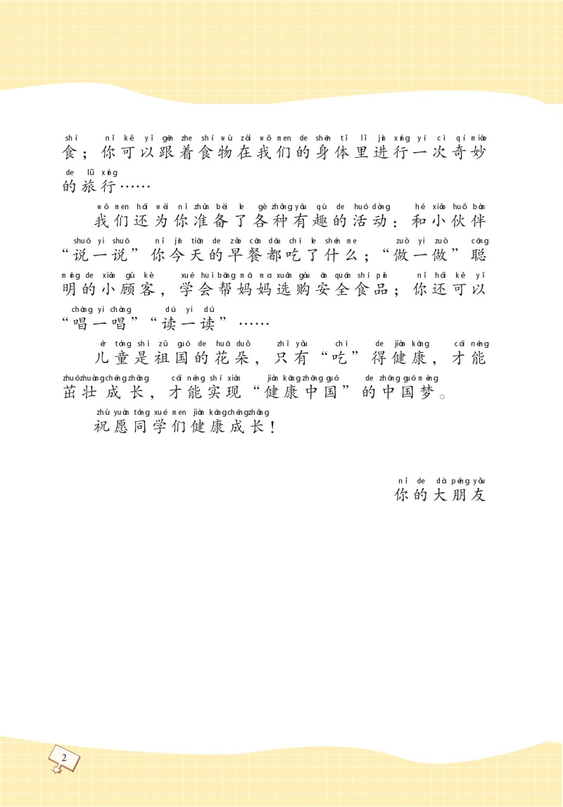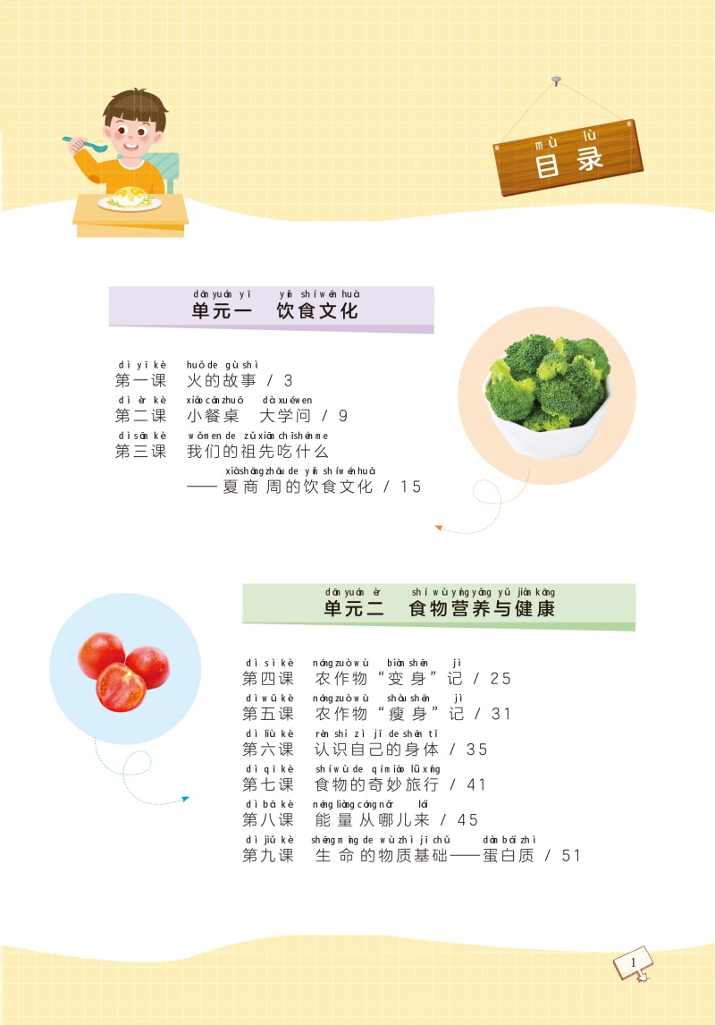 本书为中小学营养科普书,主编为北京大学公共卫生学院营养与健康学系朱文丽教授,本书为营养与健康丛书的第一册,内容包括“食品安全、食物营养、饮食习惯、饮食文化”四方面,将食物与健康的关系立体地呈现出来,全面培养学生的健康意识和观念,培养孩子珍惜粮食、勤俭节约的好习惯,让孩子懂得粮食来之不易,让学生从爱吃到学会选择,进而形成节约的意识,不再浪费粮食,从而达到科学的饮食观念。课程目录:我的学生餐、农作物变身记、小餐桌大学问、火的故事、水是最好的饮料、路边摊“美味”吗、七步洗手法、认识自己的身体、厨房安全、能量从哪儿来、能量去哪儿了。
