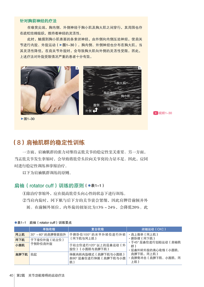 • 第二部分 “治疗关节功能障碍的物理疗法”:针对八大关节(群)的常见问题,详细介绍超声引导下的实操技术,包括关节松动术、肌肉拉伸、神经滑动训练等,并附上具体操作步骤与解剖学依据。书中特别关注关节周围神经、血管的滑动性恢复,以及动态牢固性训练,兼顾即时疗效与长期康复。