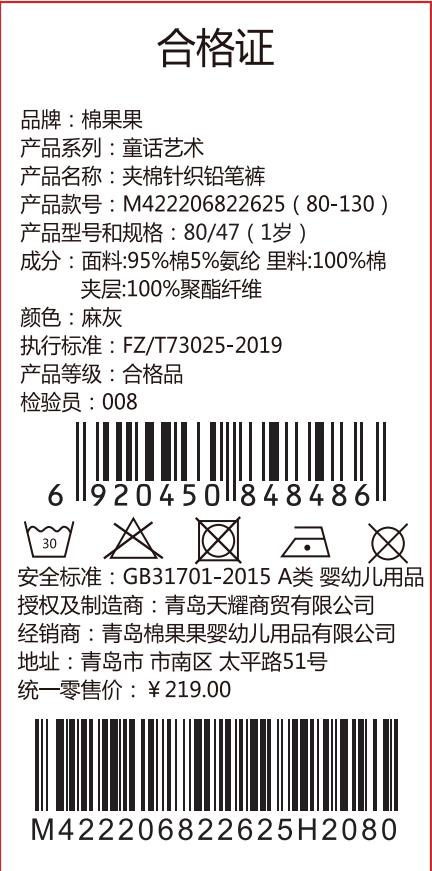 | 裤长 | 44.5 | 50 | 55.5 | 61.5 | 67.5 | 74 |