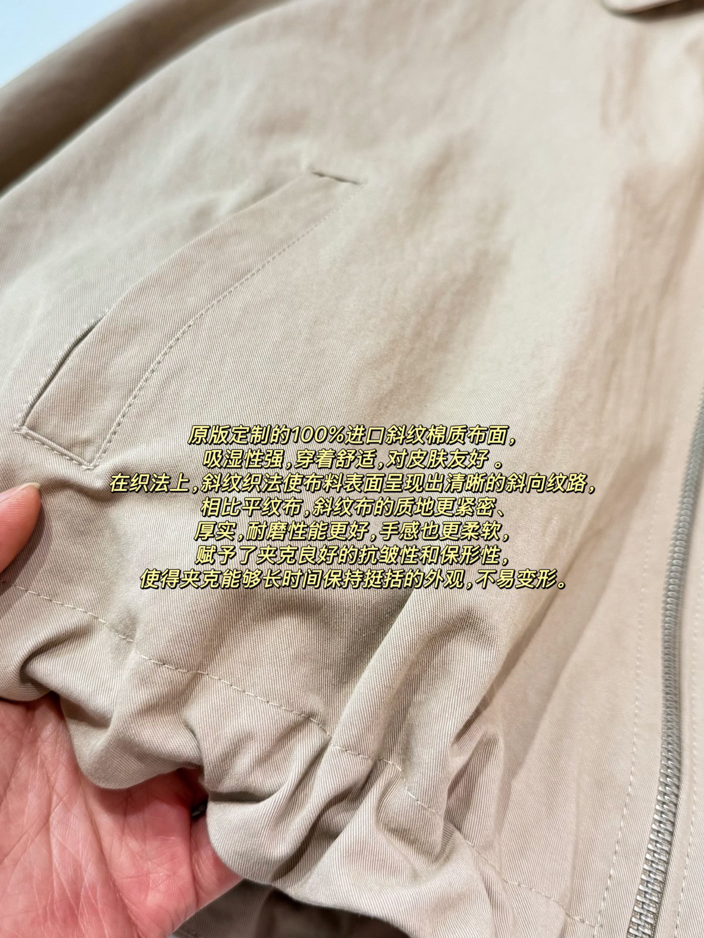 面料:原版定制的100%进口斜纹棉质布面,吸湿性强,穿着舒适,对皮肤友好 。在织法上,斜纹织法使布料表面呈现出清晰的斜向纹路,相比平纹布,斜纹布的质地更紧密、厚实,耐磨性能更好,手感也更柔软,赋予了夹克良好的抗皱性和保形性,使得夹克能够长时间保持挺括的外观,不易变形。