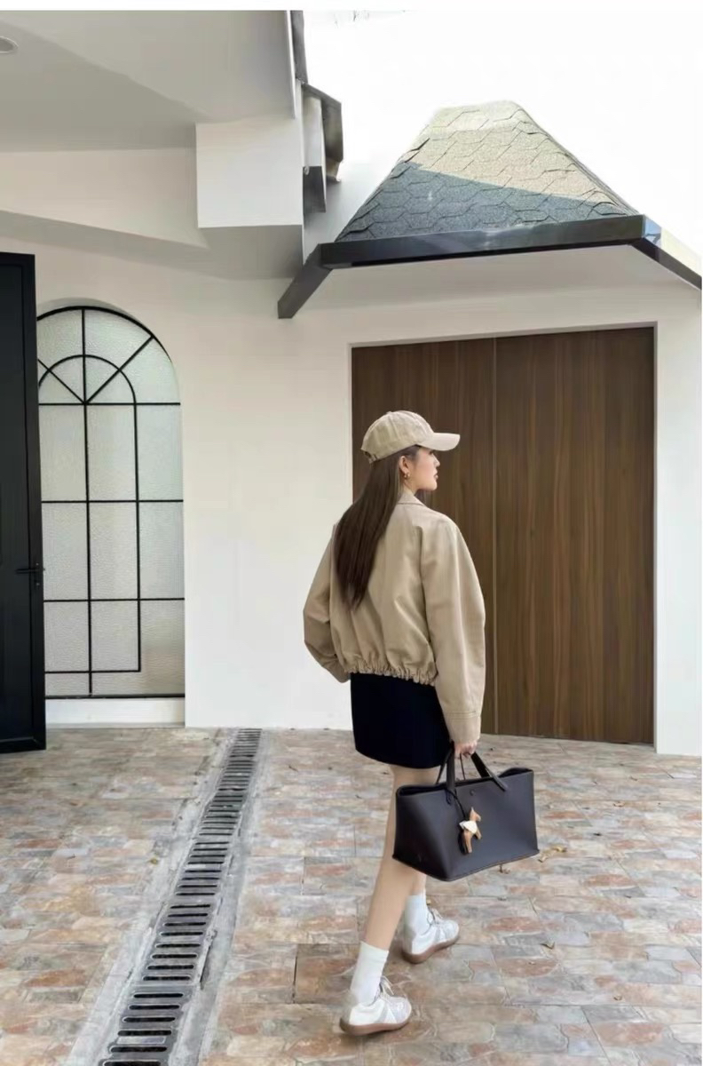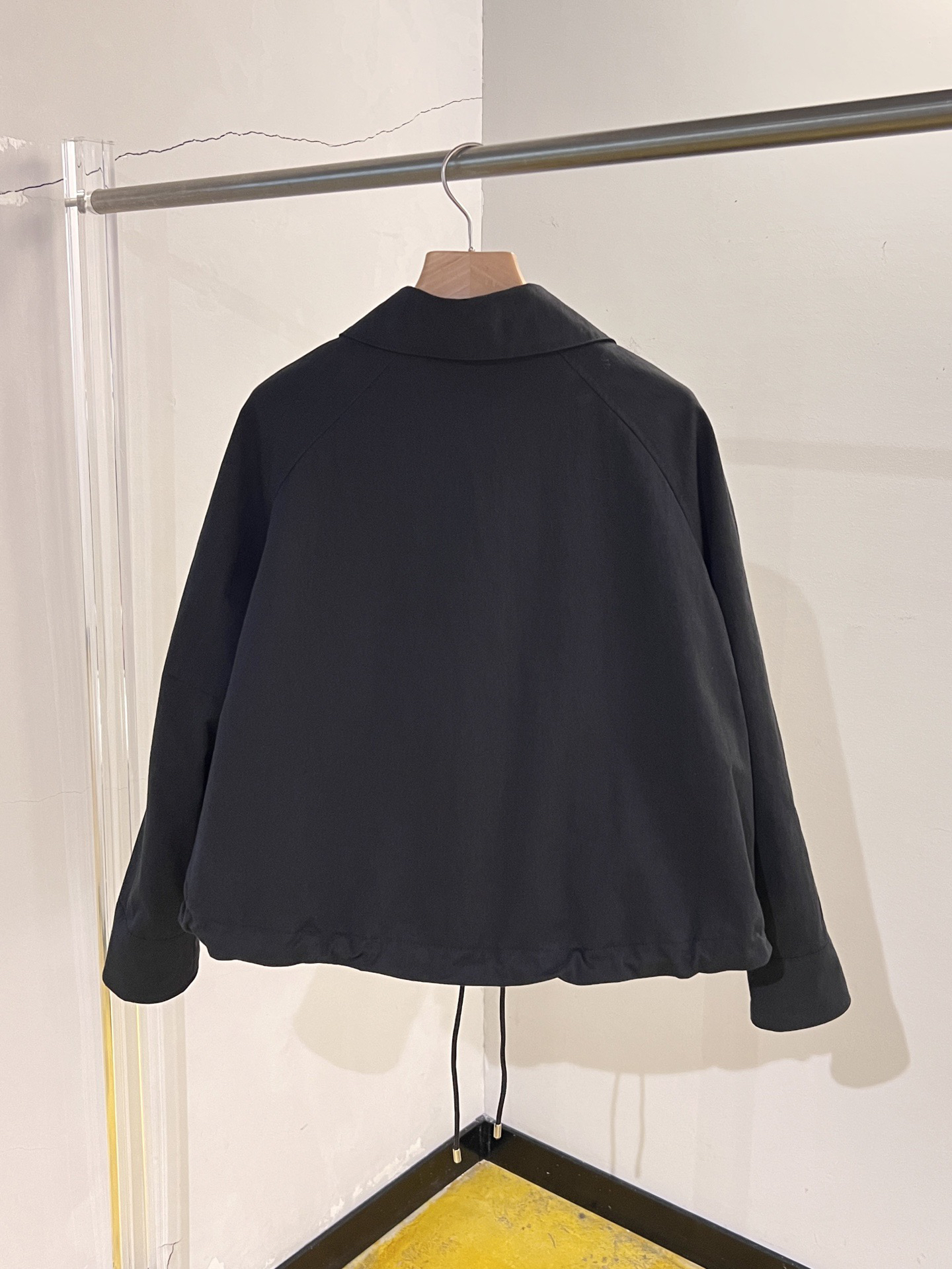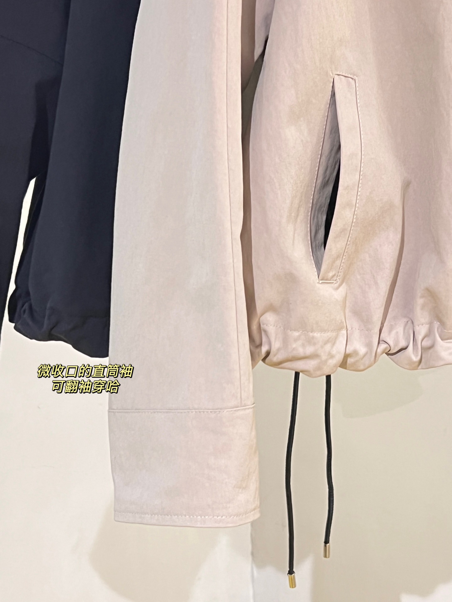 利落的短款版型。经典大翻领设计,增加复古感与时尚度 ;拉链开合方便穿脱,金属拉链质感十足。宽松的落肩长袖,对肩宽等身形包容度高。下摆处有抽绳设计,可调节出蓬松的气球感效果,增添俏皮随性氛围,整体风格休闲百搭 。~