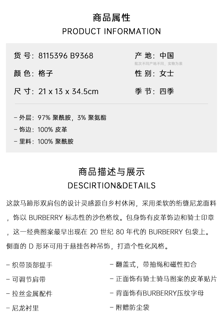 BURBERRY 巴宝莉 女士马术骑士徽标马蹄形双肩包 格子 8115396 B9368