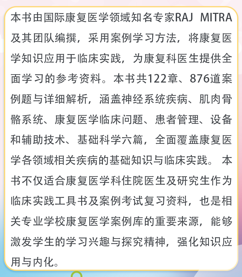 本书由国际康复医学领域知名专家 Raj Mitra 及其团队编撰,采用案例学习方法,将康复医学知识应用于临床实践,为康复科医生提供全面学习的参考资料。本书共122 章、876 道案例题与详细解析,涵盖神经系统疾病、肌肉骨骼系统、康复医学临床问题、患者管理、设备和辅助技术、基础科学六篇,全面覆盖康复医学各领域相关疾病的基础知识与临床实践。 本书不仅适合康复医学科住院医生及研究生作为临床实践工具书及案例考试复习资料,也是相关专业学校康复医学案例库的重要来源,能够激发学生的学习兴趣与探究精神,强化知识应用与内化。