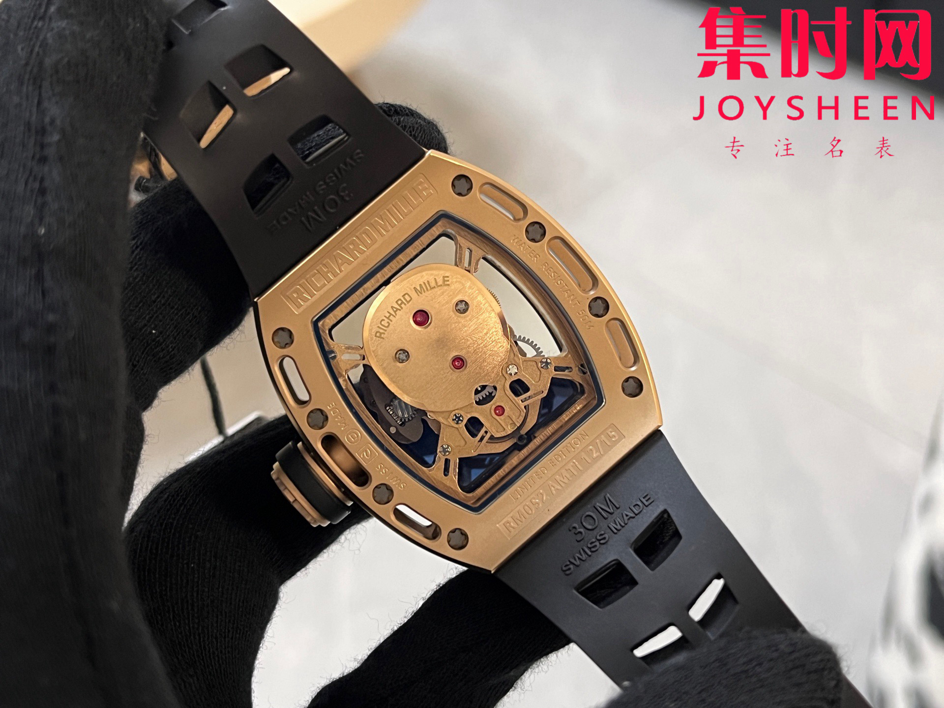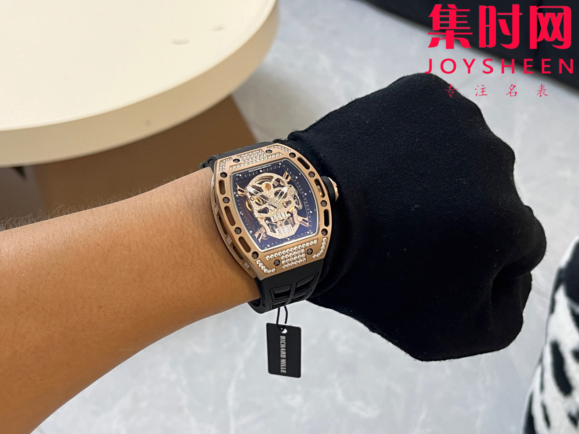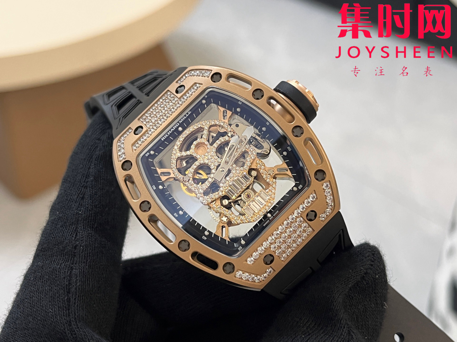 理查德米勒 RM052骷髅满天星 钻圈款 男士腕表 搭载定制一体手动上链机械机芯,鬼头经典传奇 镂空骷髅头腕表.骷髅头轮廓突出,造型霸气不羁,具有震撼人心的魅力。搭配艳耀色彩的橡轻便表带,更拉风,更前卫。腕间搭上鲜艳的表款,是不是很吸睛?表壳尺寸:43mmx50mm 真实展现!