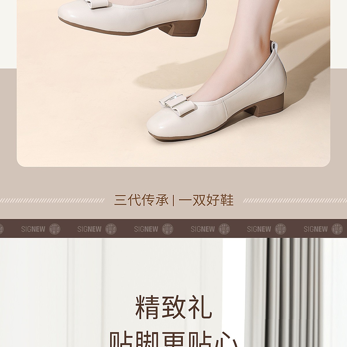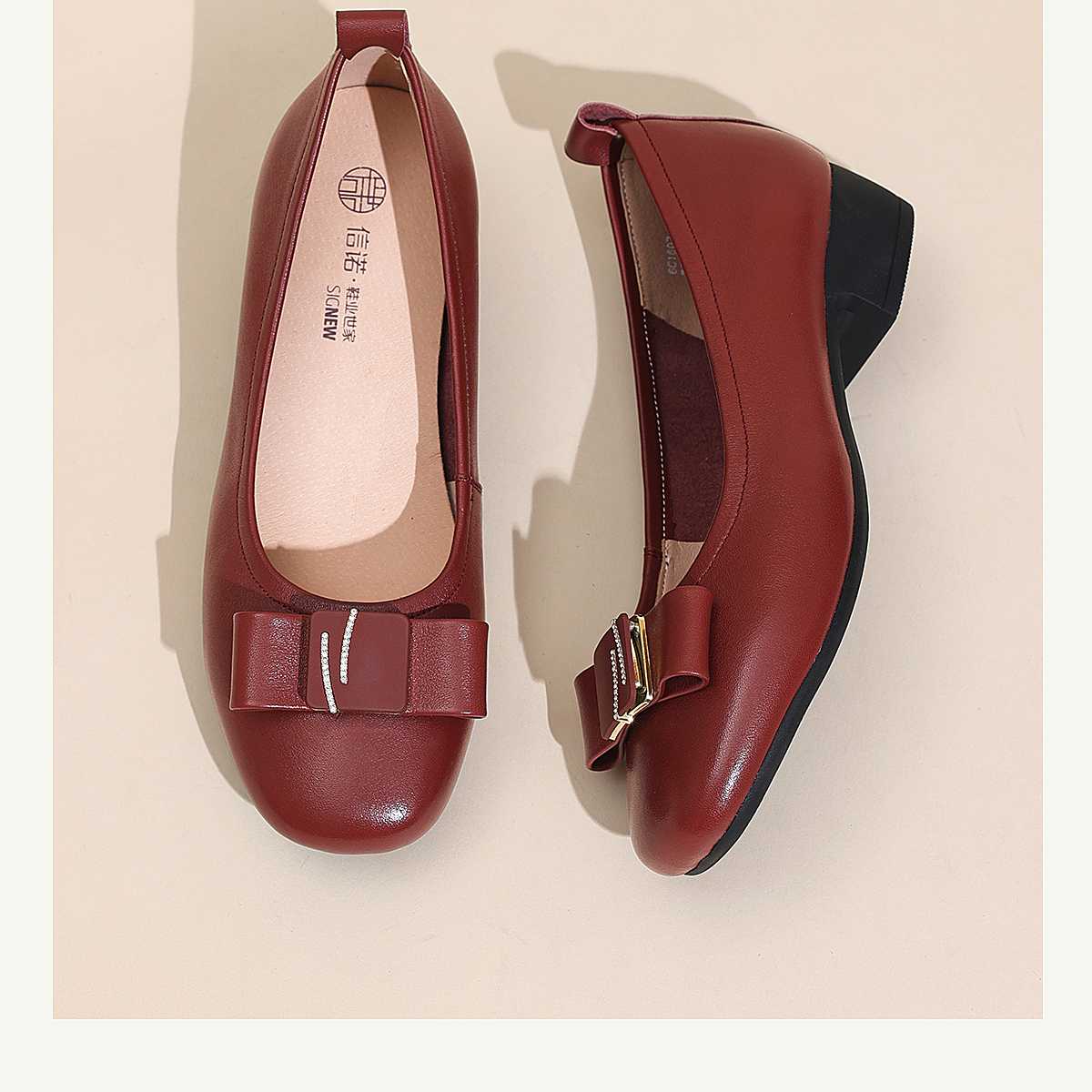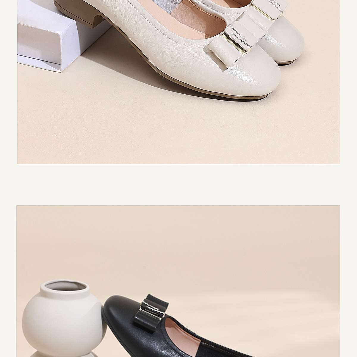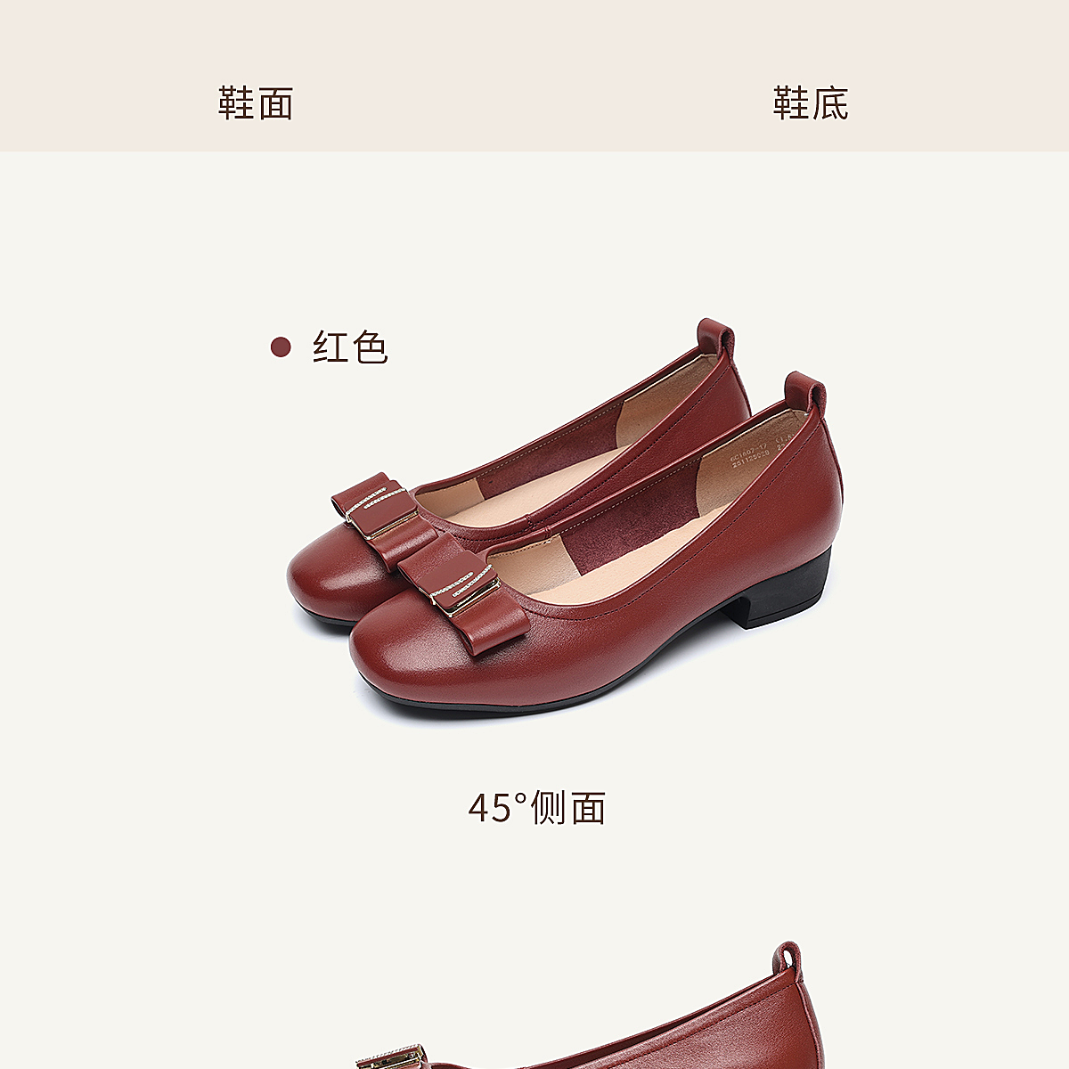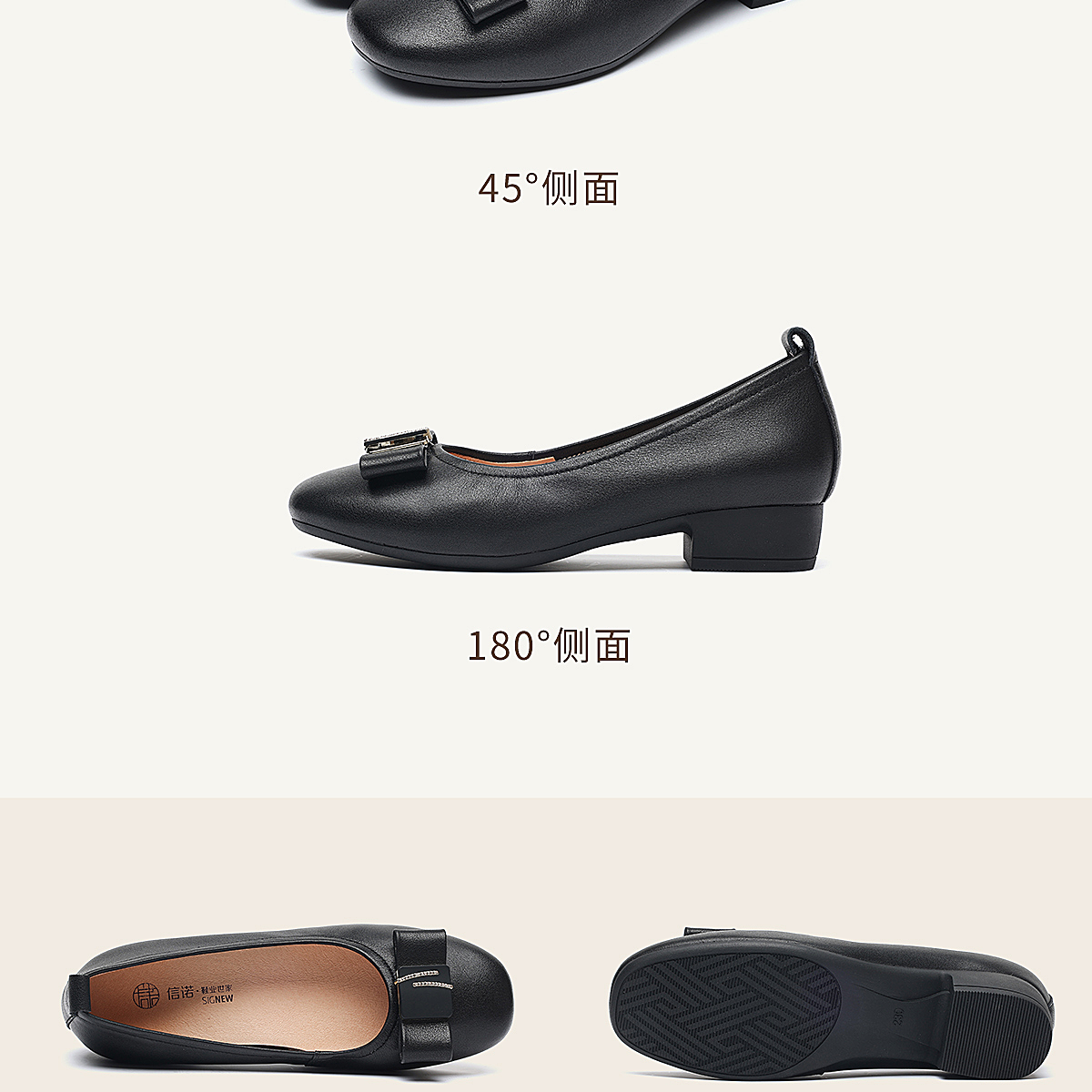 通勤风真皮蝴蝶结粗跟单鞋女一脚蹬软底妈妈鞋黑色浅口鞋6C1607-17