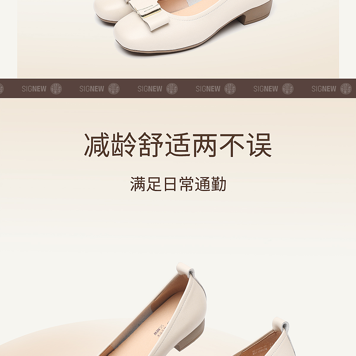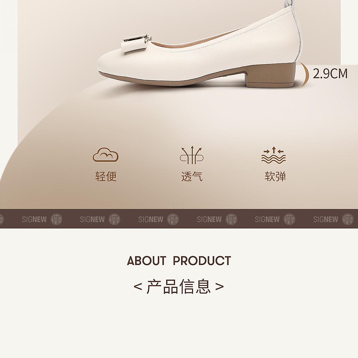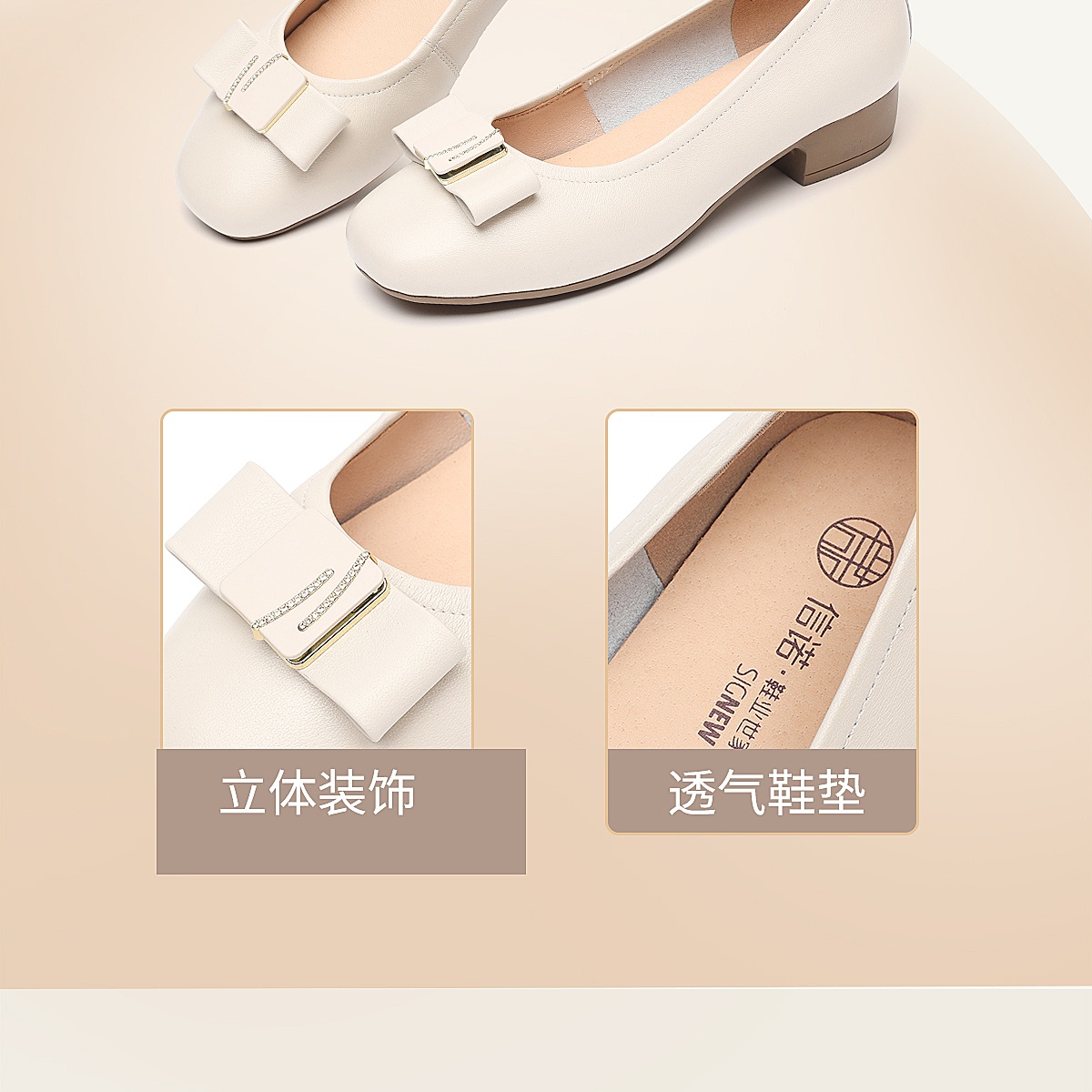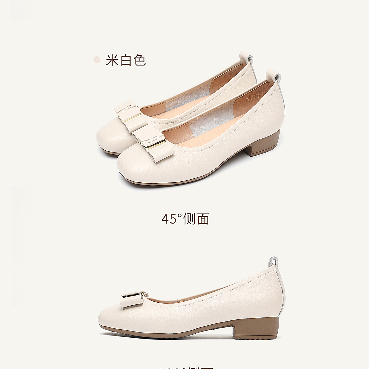 通勤风真皮蝴蝶结粗跟单鞋女一脚蹬软底妈妈鞋黑色浅口鞋6C1607-17