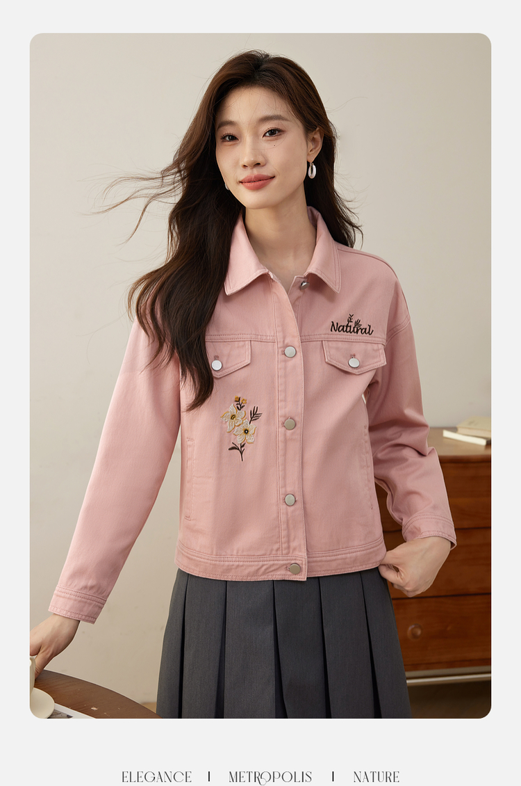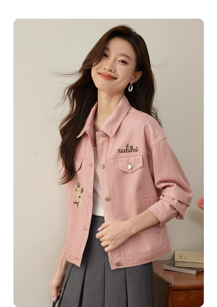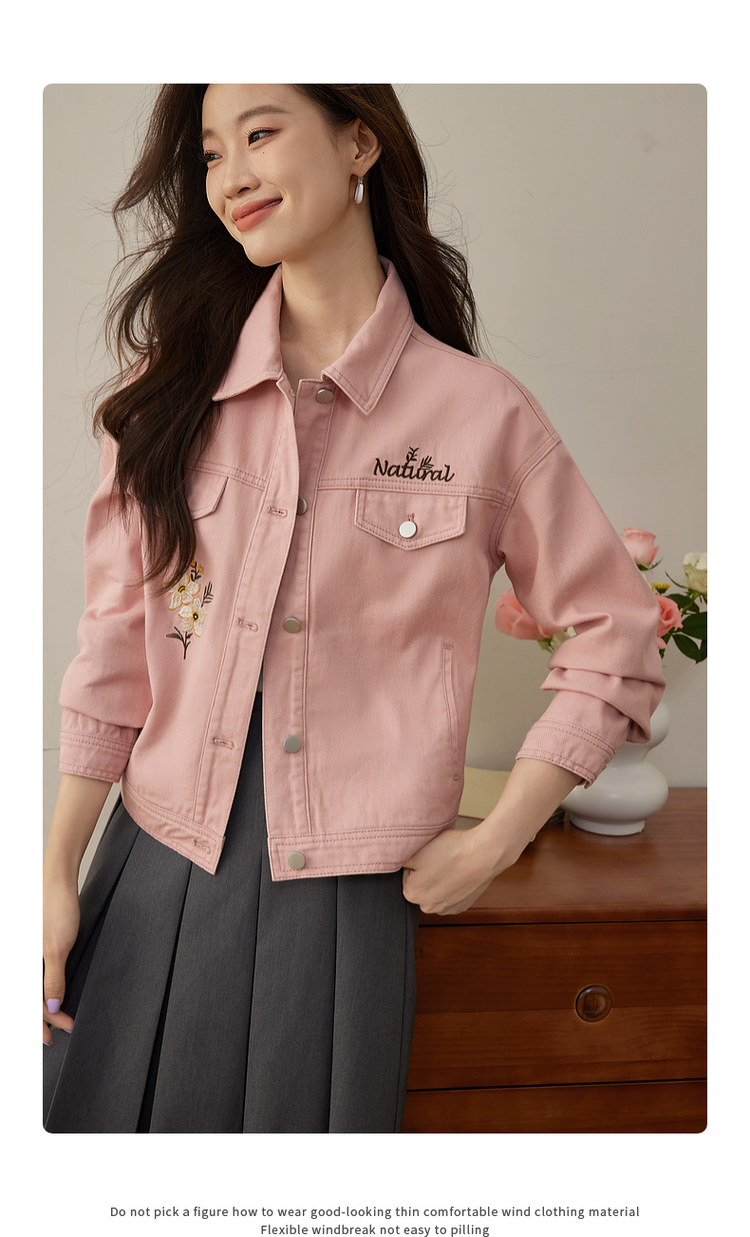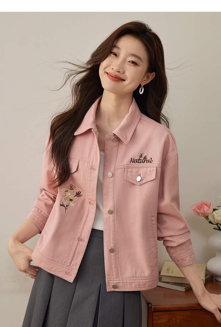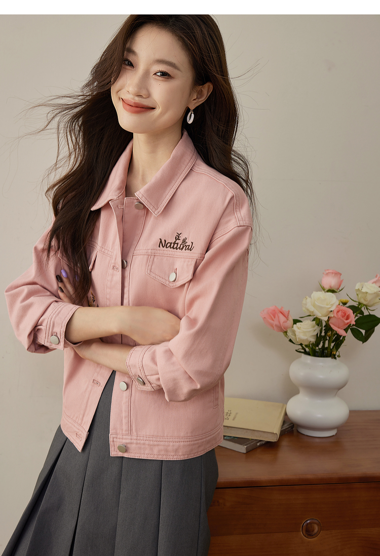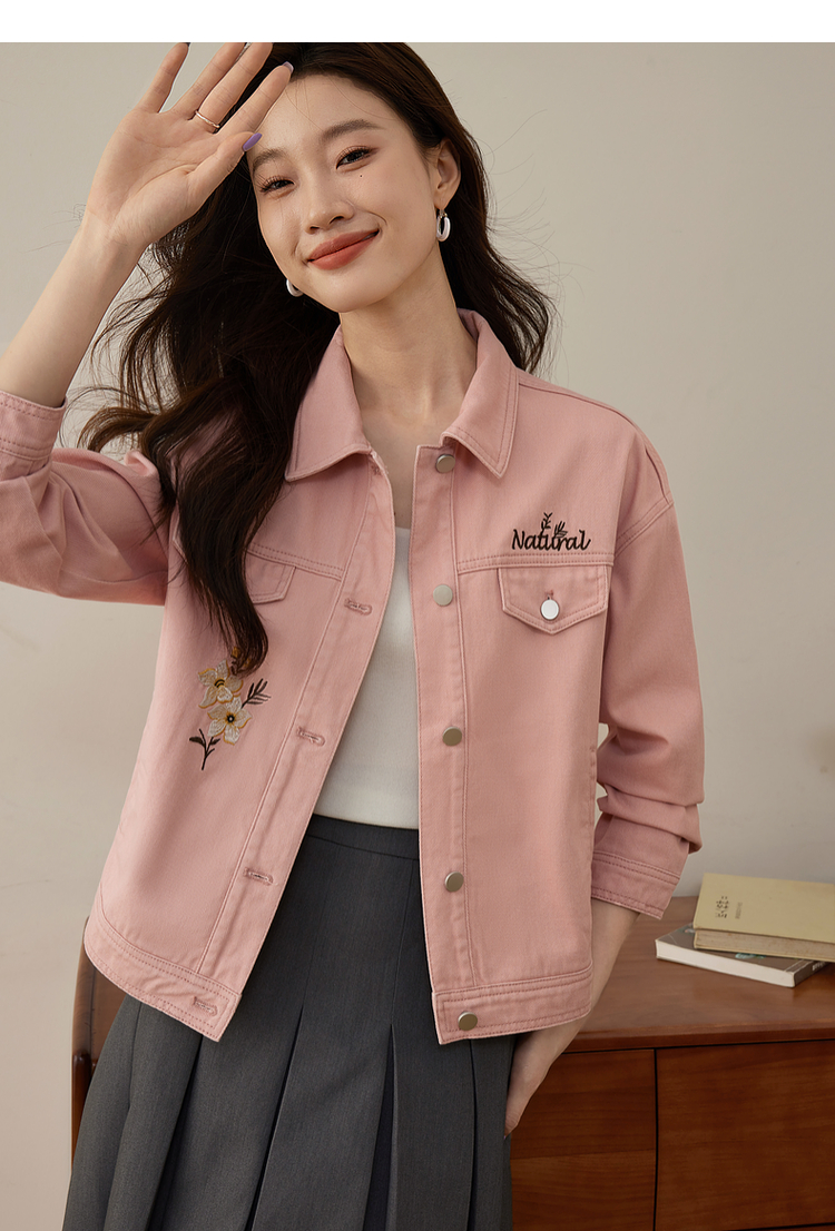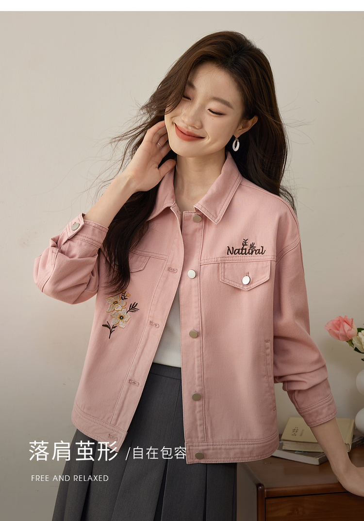 【专属特价】熙世界文艺复古字母绣花牛仔外套短款粉色夹克上衣2025秋装新款