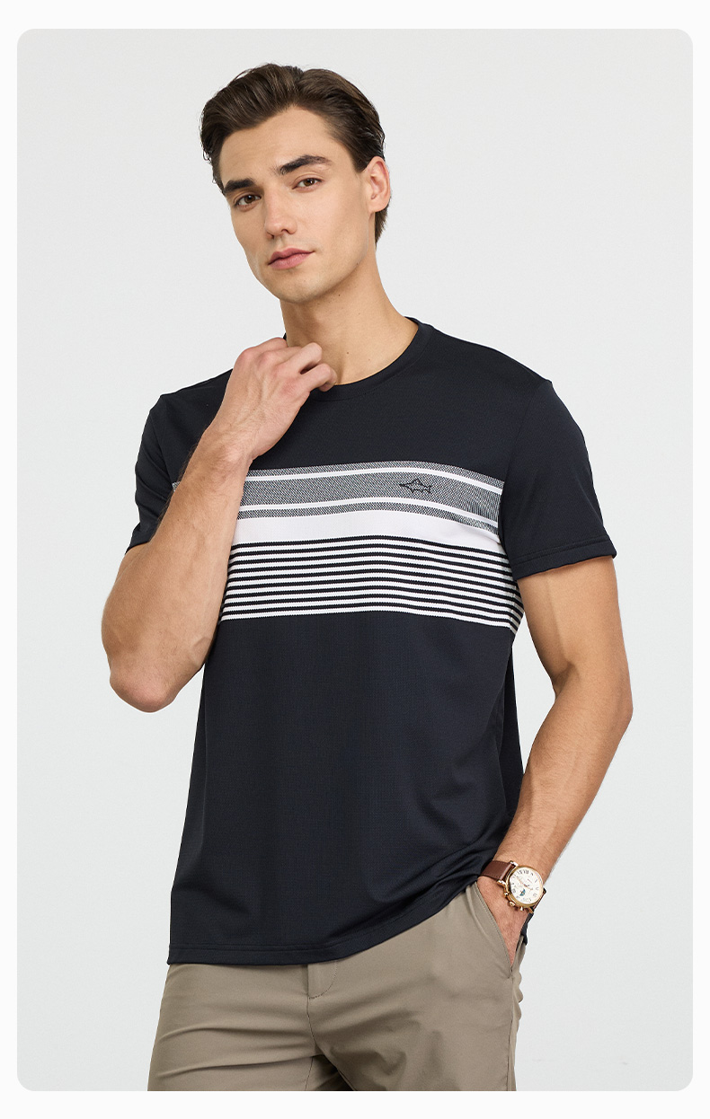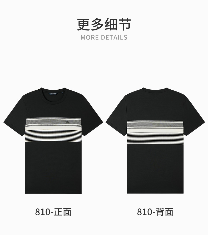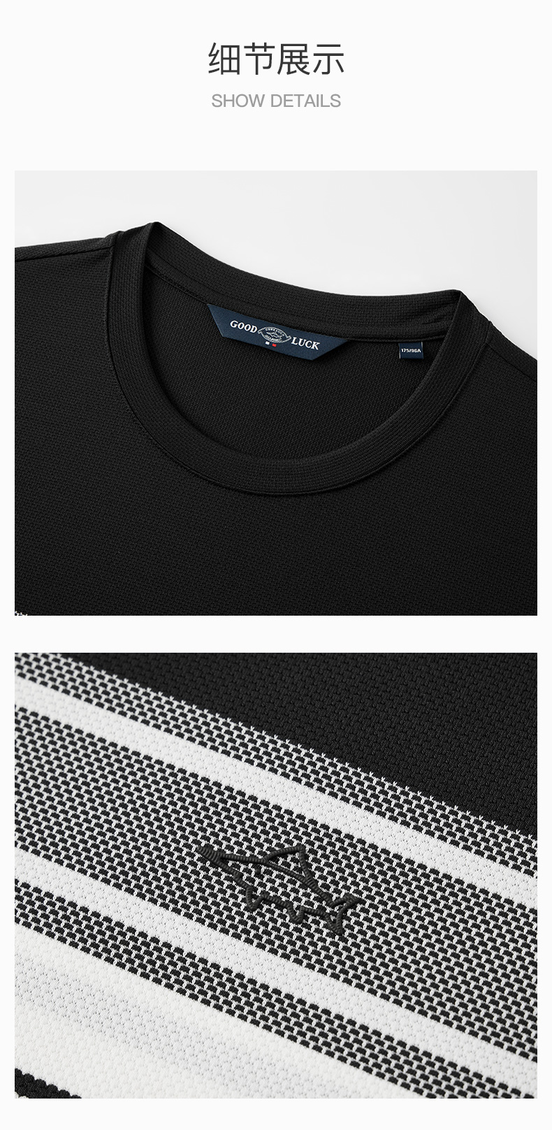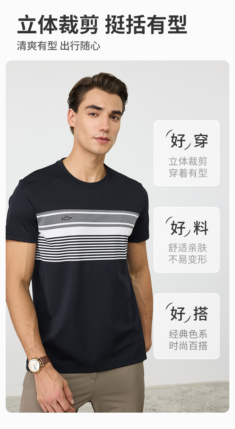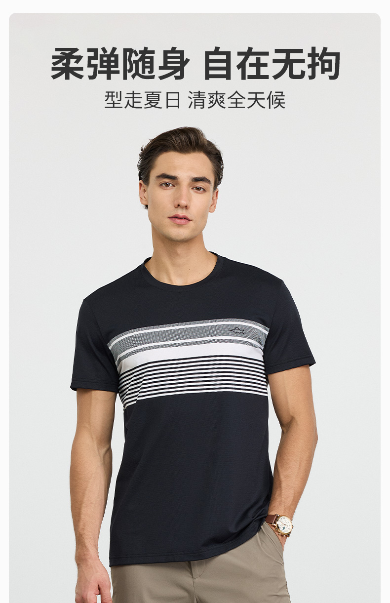 【高弹舒适】德鲨黑色短袖圆领T恤男2026夏季新款条纹撞色打底衫