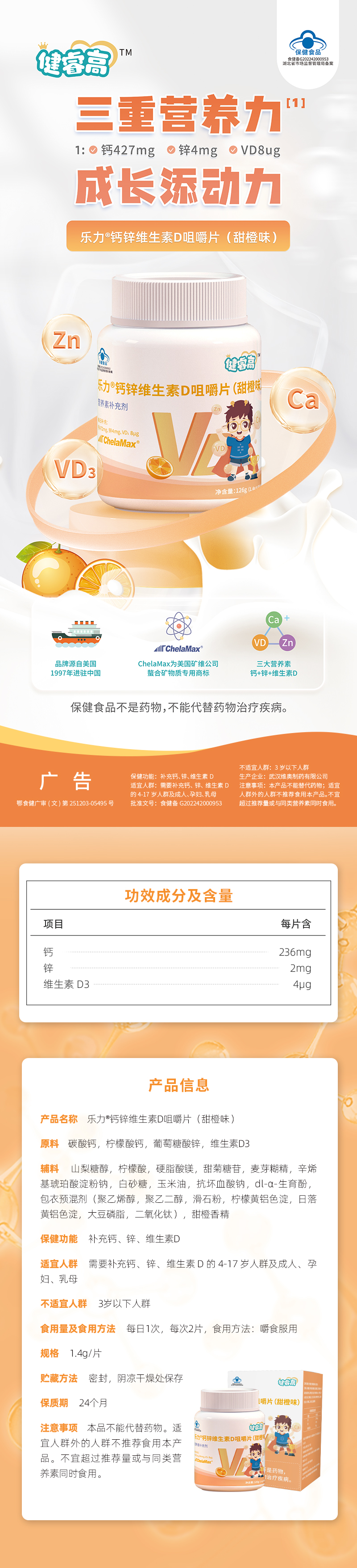 【长沙】乐力®钙锌维生素D咀嚼片(甜橙味)