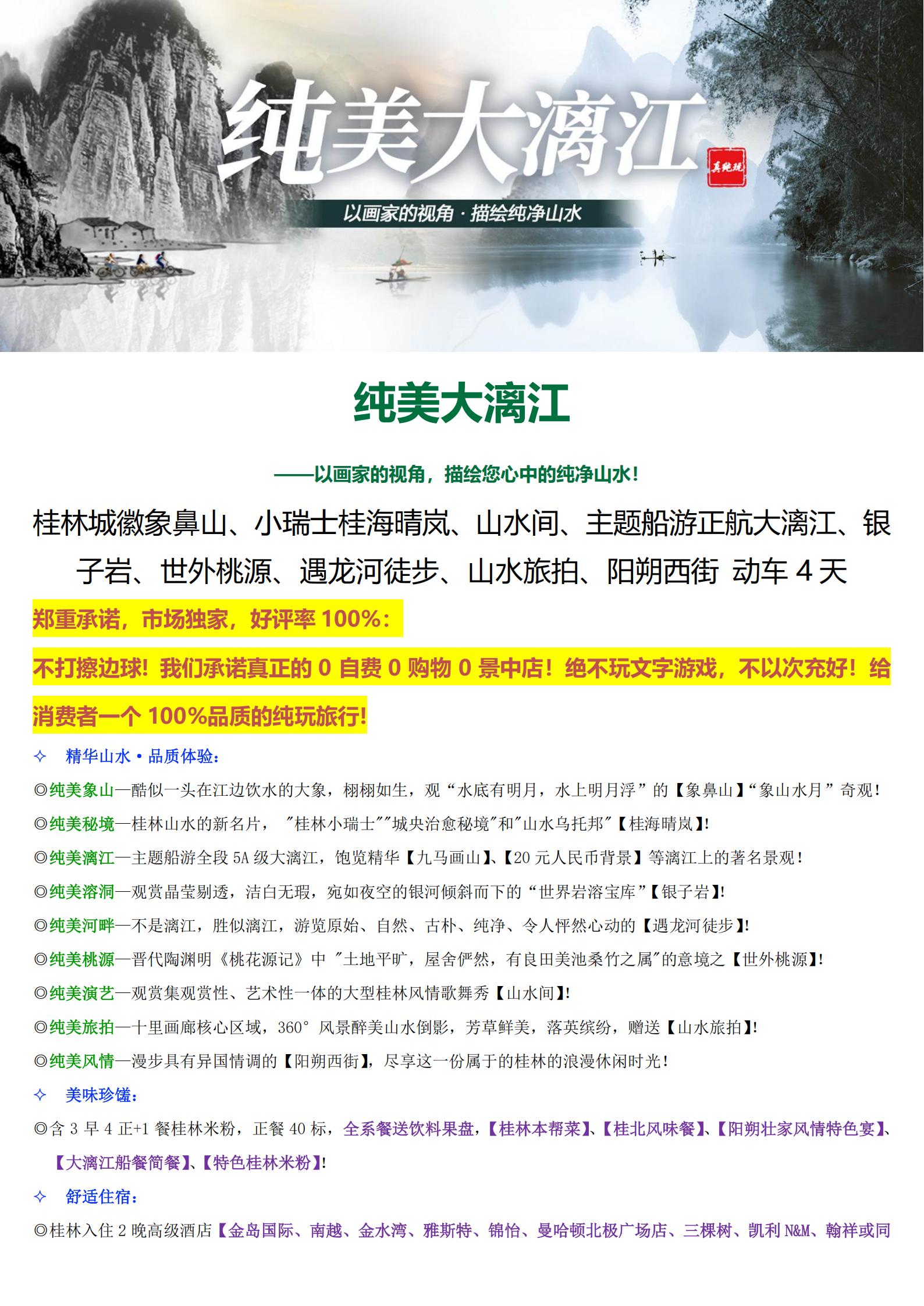 <桂林+阳朔4天动车团(20人精致小团)>主题船游正航大漓江、象鼻山、小瑞士桂海晴岚、山水间、银子岩、世外桃源、遇龙河徒步、山水旅拍、阳朔西街