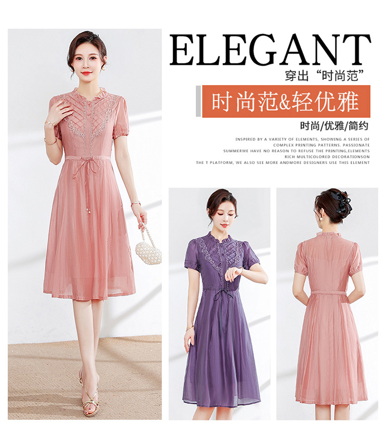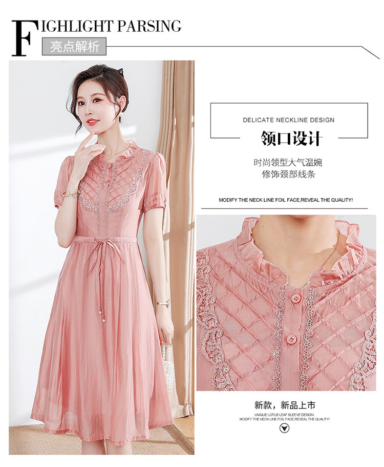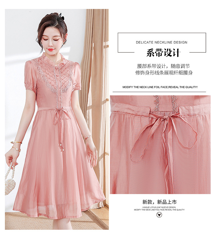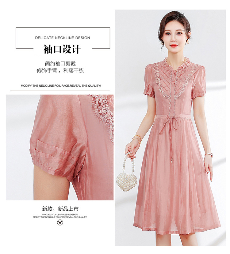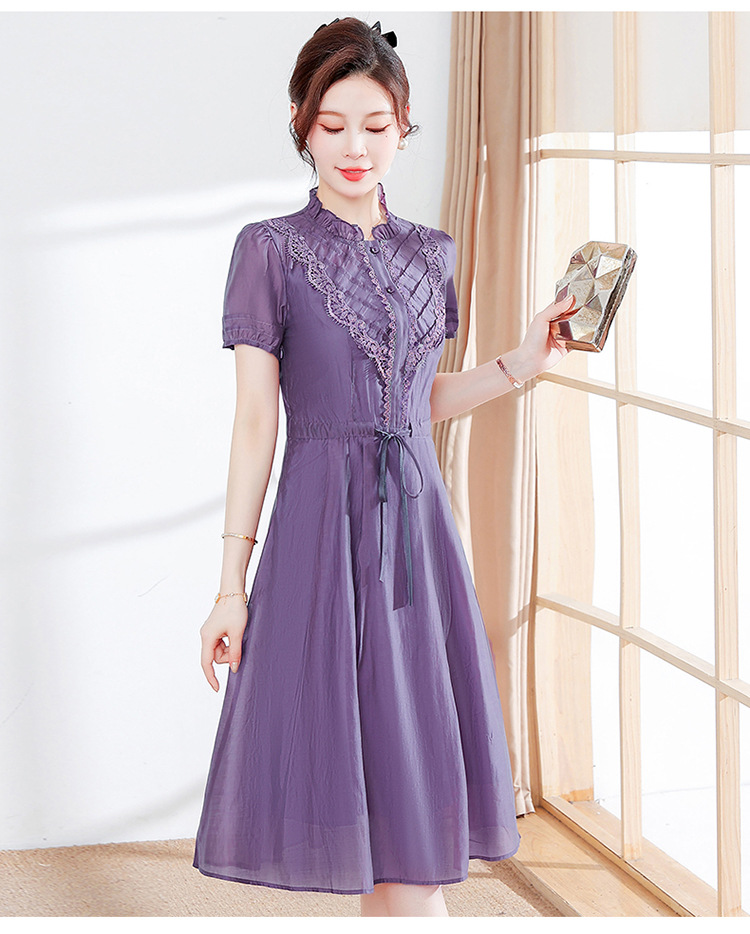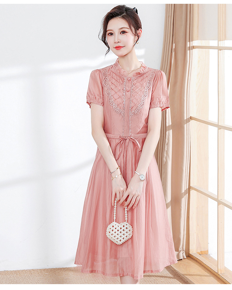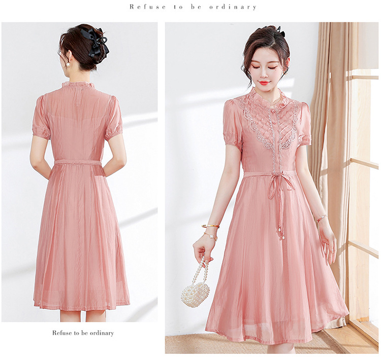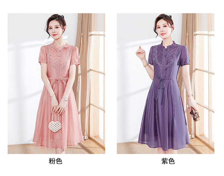 夏季新款,纯色系带收腰裙木耳边圆领短袖裙时尚女装中长款A字裙QYM-JJ-GQ967-Y