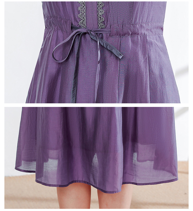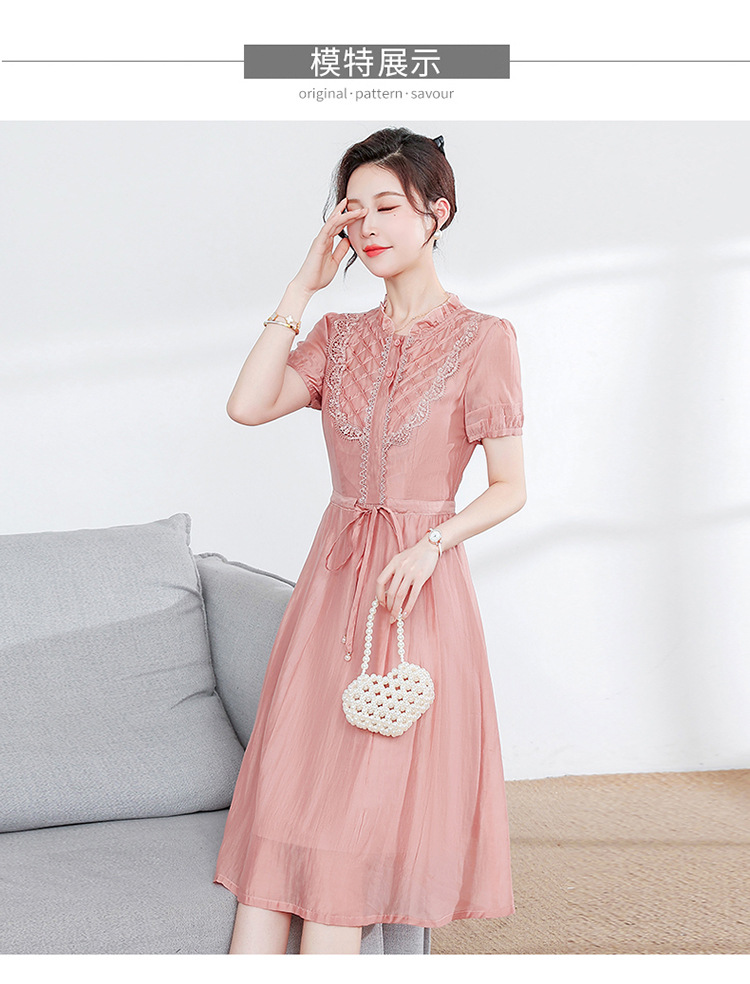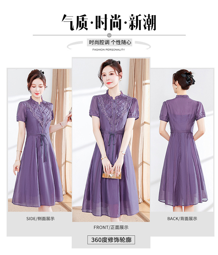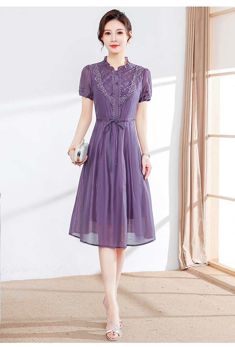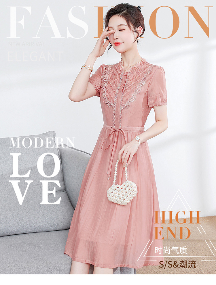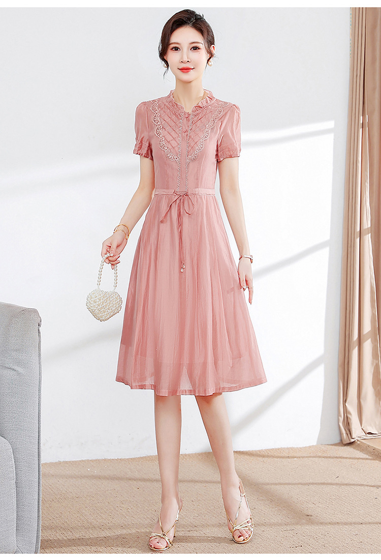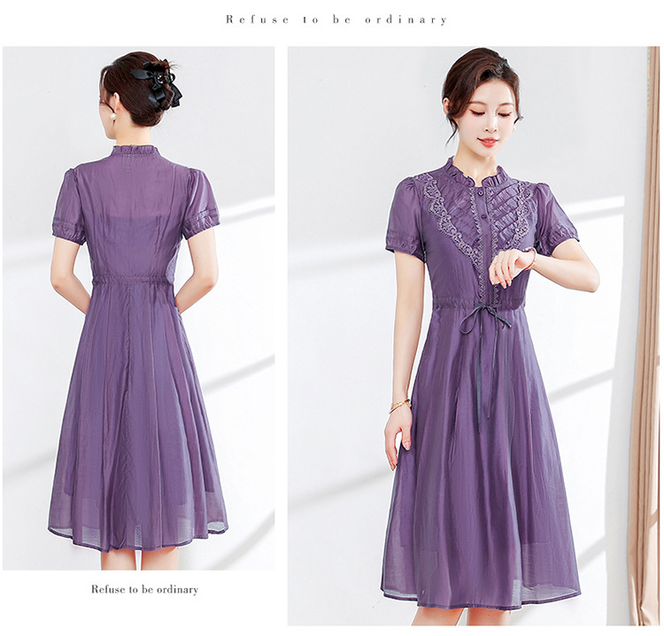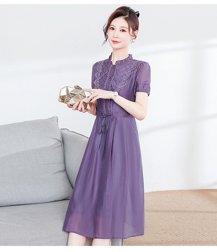 夏季新款,纯色系带收腰裙木耳边圆领短袖裙时尚女装中长款A字裙QYM-JJ-GQ967-Y